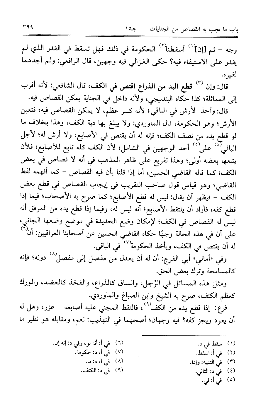 قال: واخذ الأرش في الباقي؛ لأنه كسر عظم، لا يمكن القصاص فيه؛ فتعين الأرش؛ وهو الحكومة، قال الماوردي: ولا يبلغ بها دية الكف، وهذا بخلاف ما لو قطع يده من نصف الكف؛ فإنه له أن يقتص في الأصابع، ولا أرش له؛ لأجل الباقي على أحد الوجهين في الشامل؛ لان الكف كله تابع للأصابع؛ فلان يتبعها بعضه أولى؛ وهذا تفريع على ظاهر المذهب في أنه لا قصاص في بعض الكف؛ كما قاله القاضي الحسين، أما إذا قلنا بأن فيه القصاص – كما افهمه لفظ القاضي؛ وهو قياس قول صاحب التقريب في إيجاب القصاص في قطع بعض الكف – فيظهر أن يقال: ليس له قطع الأصابع؛ كما صرح به الأصحاب؛ فيما إذا قطع كفه، فأراد أن يلتقط الأصابع؛ أنه ليس له، وفيما إذا قطع يده من المرفق أنه ليس له القصاص في الكف؛ لإمكان وضع الحديدة في موضع وضعها الجاني، على أن في هذه الحالة وجهاً حكاه القاضي الحسين عن أصحابنا العراقيين: أن له أن يقتص في الكف، ويأخذ الحكومة في الباقي.