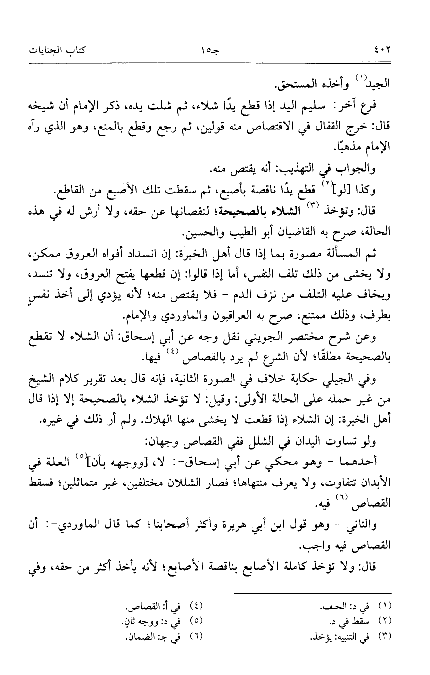 فرع آخر: سليم اليد إذا قطع يداً شلاء، ثم شلت يده، ذكر الإمام أن شيخه قال: خرج القفال في الاقتصاص منه قولين، ثم رجع وقطع بالمنع، وهو الذي رآه الإمام مذهباًز