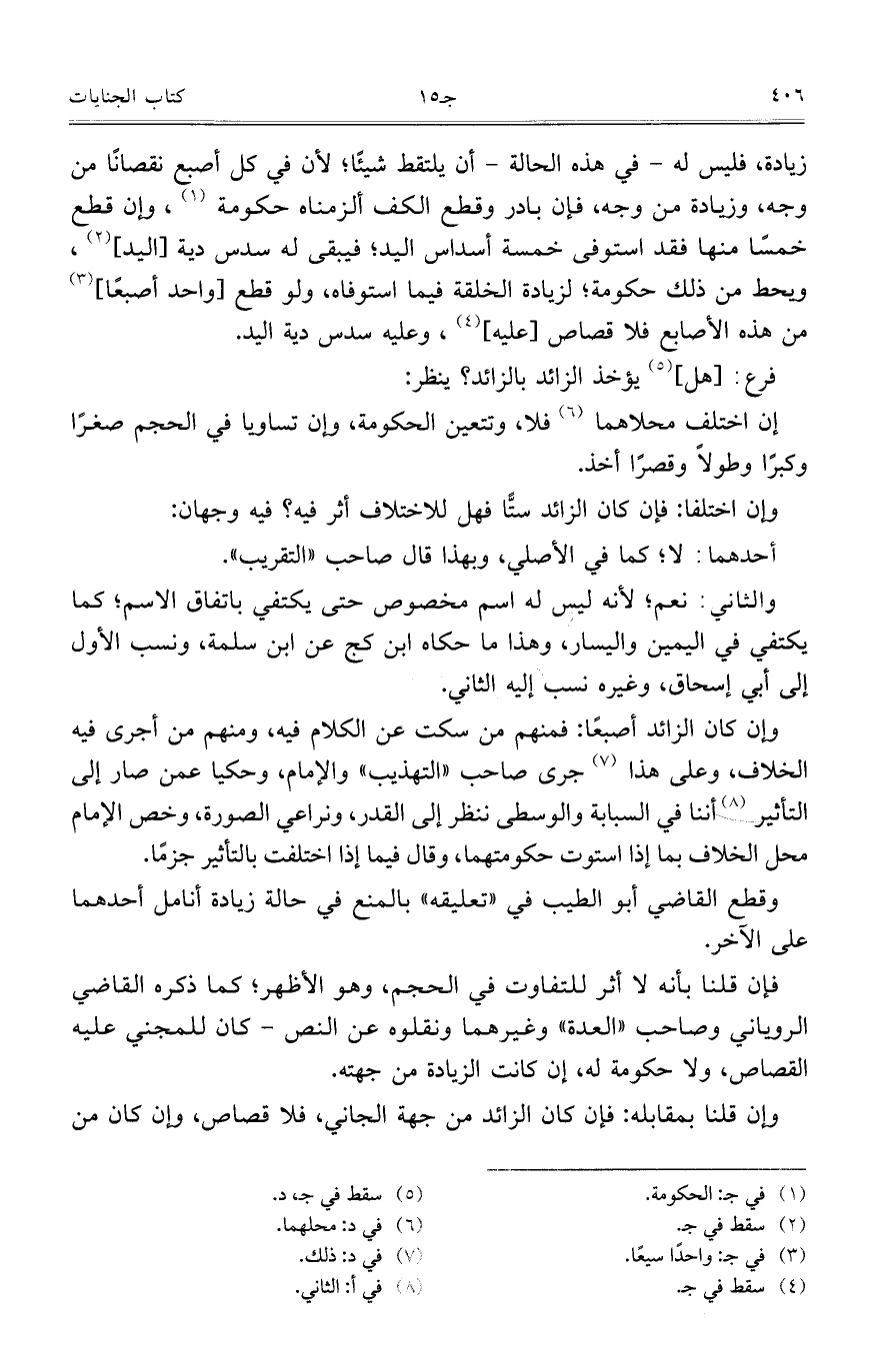 وإن كان الزائد أصبعاً: فمنهم من سكت عن الكلام فيه، ومنهم من أجرى فيه الخلاف، وعلى هذا جرى صاحب "التهذيب" والإمام، وحكيا عمن صار إلى التأثير أننا في السبابة والوسطى ننظر إلى القدر، ونراعي الصورة، وخص الإمام محل الخلاف بما إذا استوت حكومتهما، وقال فيما إذا اختلفت بالتأثير جزماً.