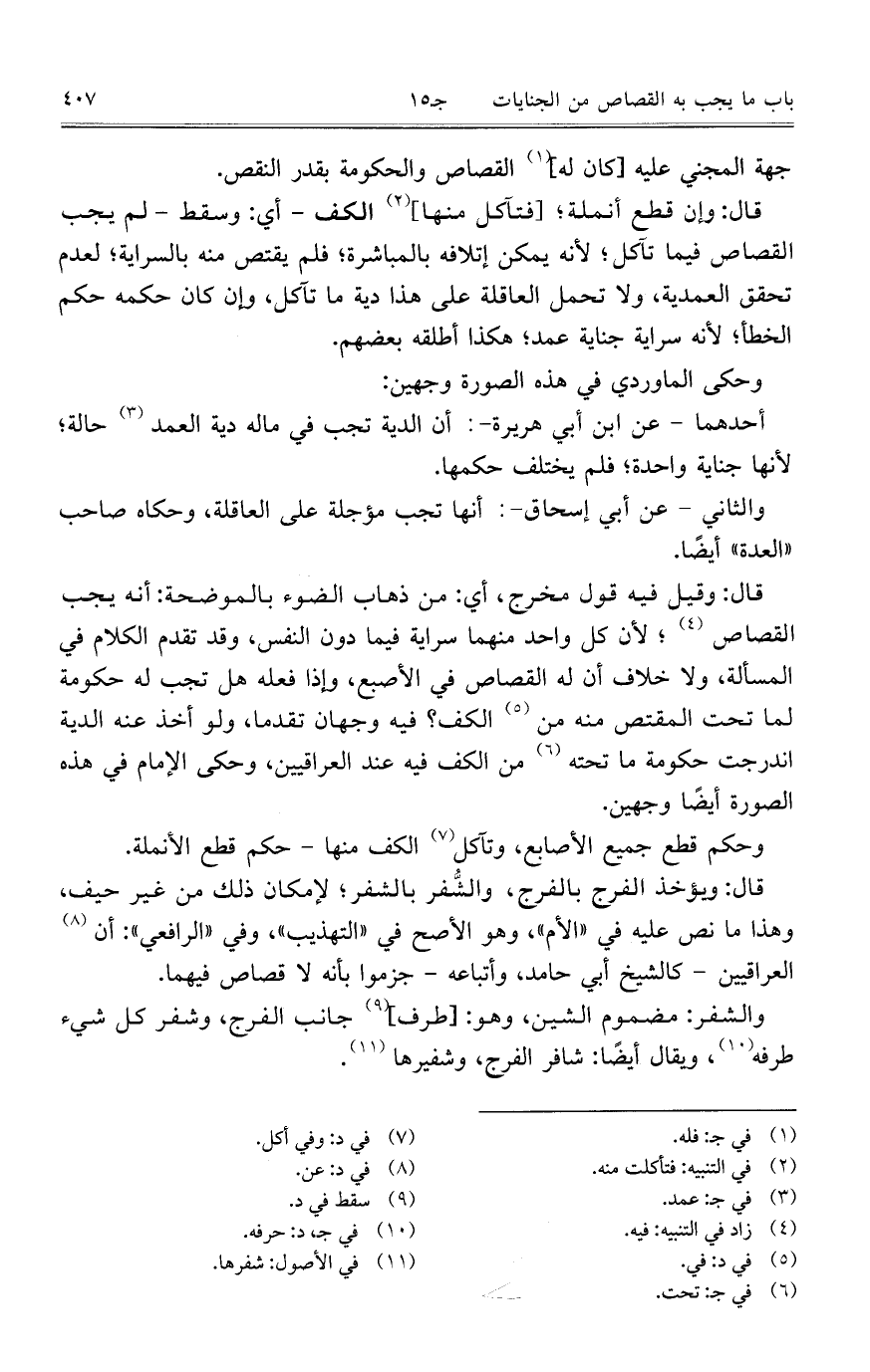 قال: وإن قطع أنملة؛ [فتآكل منها] الكف – أي: وسقط – لم يجب القصاص فيما تآكل؛ لأنه يمكن إتلافه بالمباشرة؛ فلم يقتص منه بالسراية؛ لعدم تحقق العمدية، ولا تحمل العاقلة على هذا دية ما تآكل، وإن كان حكمه حكم الخطأ؛ لأنه سراية جناية عمد؛ هكذا أطلقه بعضهم.