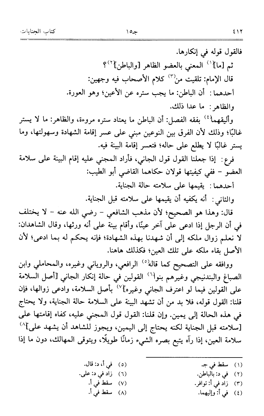 ووافقه على التصحيح كما قاله الرافعي، والروياني وغيره، والمحاملي وابن الصباغ والبندنيجي وغيرهم بنوا لقولين في حالة إنكار الجاني [أصل السلامة على القولين فيما لو اعترف الجاني وغيره] بأصل السلامة، وادعى زوالها، فإن قلنا: القول قوله، فلابد من أن تشهد البينة على السلامة حالة الجناية، ولا يحتاج في هذه الحالة إلى يمين. وإن قلنا: القول قول المجني عليه، كفاه إقامتها على [سلامته قبل الجناية لكنه يحتاج إلى اليمين، ويجوز للشاهد أن يشهد على] سلامة العين، إذا رآه يتبع بصره الشيء زماناً طويلاً، ويتوقى المهالك، دون ما إذا