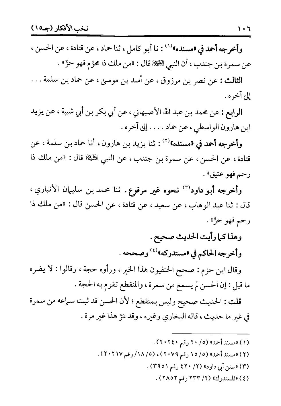 وقال ابن حزم: صحح الحنفيون هذا الخبر، ورأوه حجة، وقالوا: لا يضره ما قيل: إن الحسن لم يسمع من سمرة، والمنقطع تقوم به الحجة.