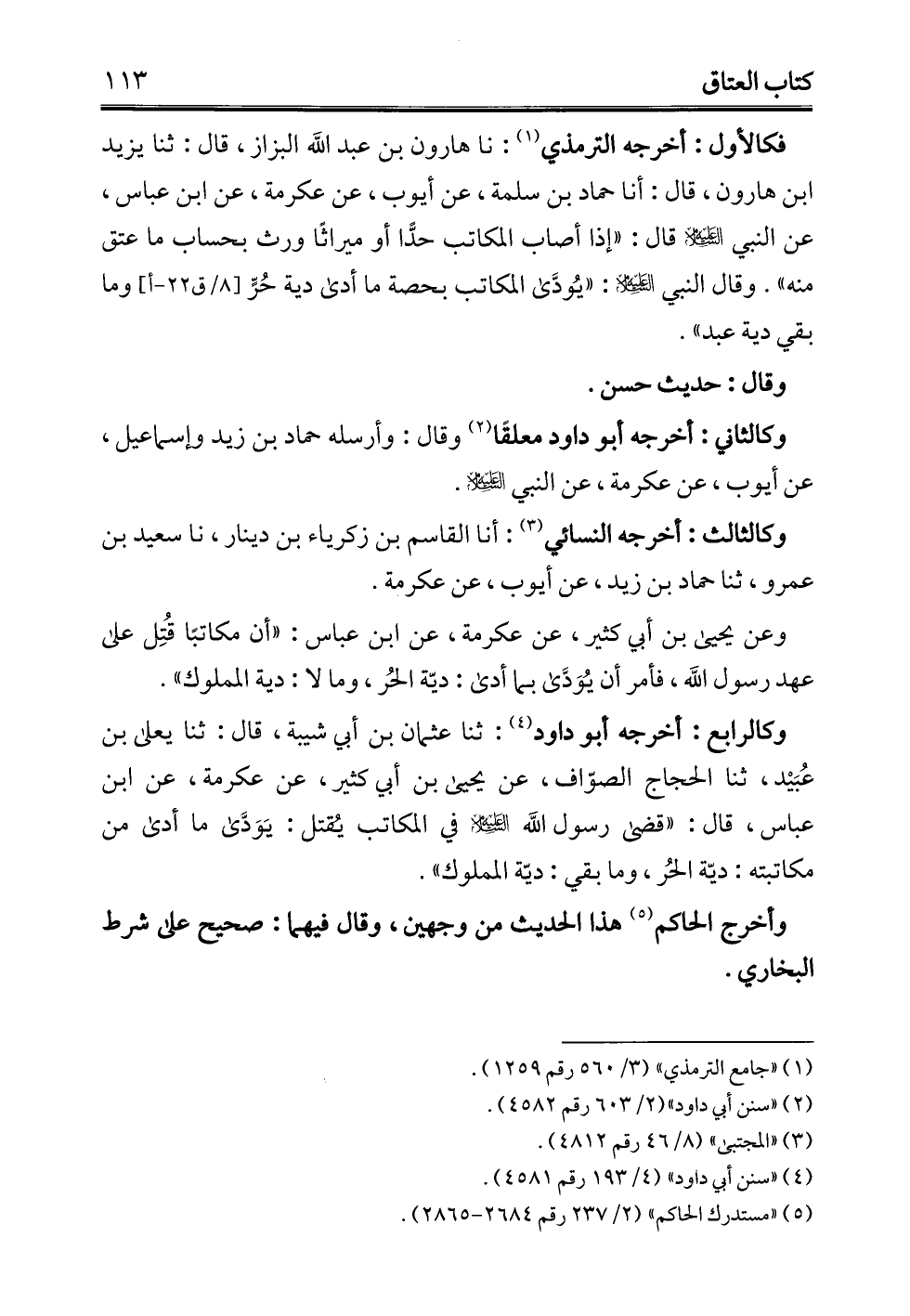 فكالأول: أخرجه الترمذي (¬1): نا هارون بن عبد الله البزاز، قال: ثنا يزيد ابن هارون، قال: أنا حماد بن سلمة، عن أيوب، عن عكرمة، عن ابن عباس، عن النبي -عليه السلام- قال: "إذا أصاب المكاتب حدًّا أو ميراثًا ورث بحساب ما عتق منه". وقال النبي -عليه السلام-: "يُودَّى المكاتب بحصة ما أدى دية حُرٍّ وما بقي دية عبد".