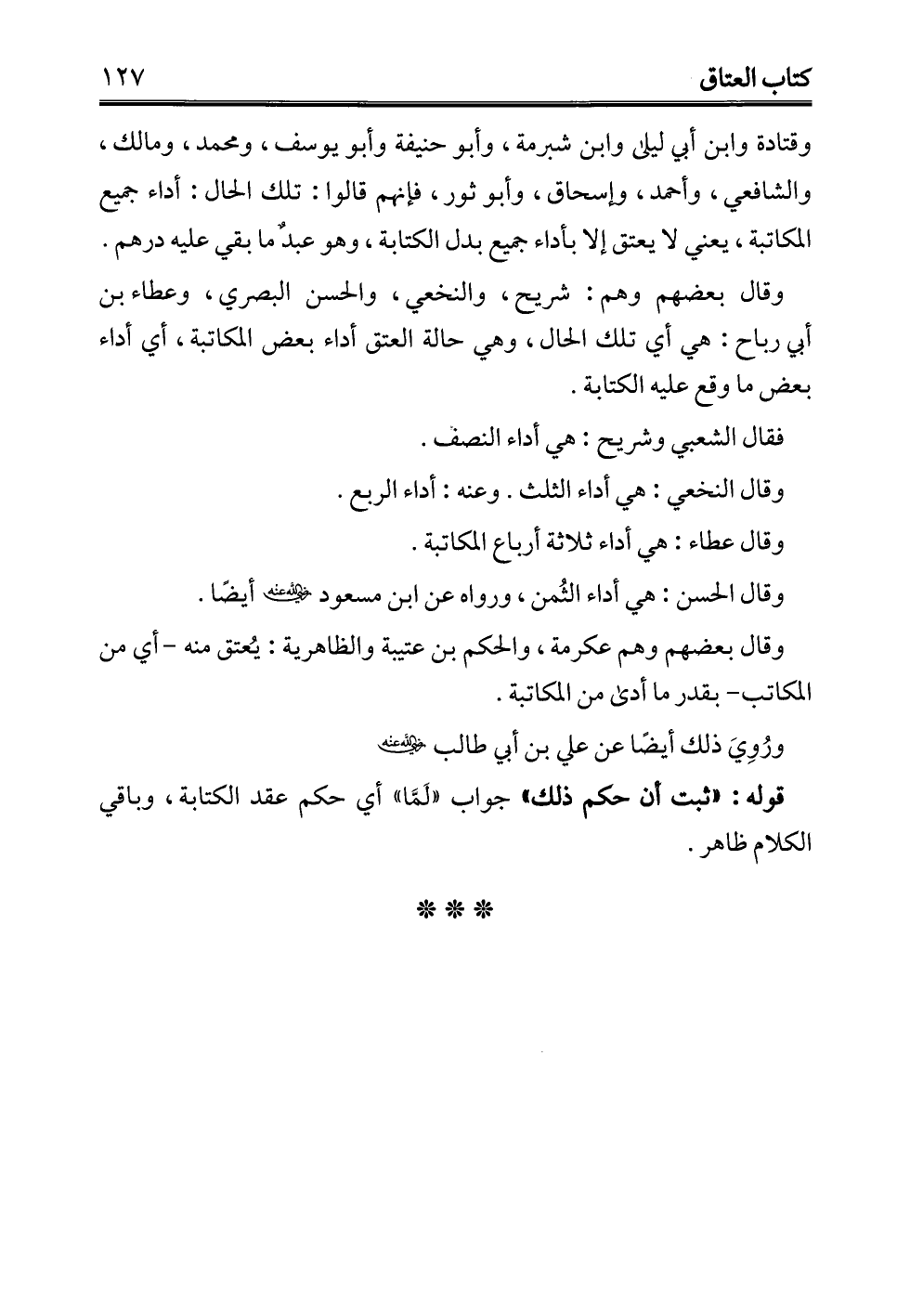 وقتادة وابن أبي ليلى وابن شبرمة، وأبو حنيفة وأبو يوسف، ومحمد، ومالك، والشافعي، وأحمد، وإسحاق، وأبو ثور، فإنهم قالوا: تلك الحال: أداء جميع المكاتبة، يعني لا يعتق إلا بأداء جميع بدل الكتابة، وهو عبدٌ ما بقي عليه درهم.