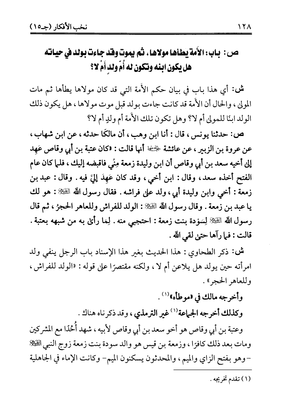 ص: حدثنا يونس، قال: أنا ابن وهب، أن مالكًا حدثه، عن ابن شهاب، عن عروة بن الزبير، عن عائشة - رضي الله عنها - أنها قالت: "كان عتبة بن أبي وقاص عَهِد إلى أخيه سعد بن أبي وقاص أن ابن وليدة زمعة مِنِّي فاقبضه إليك، فلما كان عام الفتح أخذه سعد، وقال: ابن أخي، وقد كان عَهِدَ إليَّ فيه. وقال: عبد بن زمعة: أخي وابن وليدة أبي، ولد على فراشه. فقال رسول الله -عليه السلام-: هو لك يا عبد بن زمعة. وقال رسول الله -عليه السلام-: الولد للفراش وللعاهر الحجرُ، ثم قال رسول الله -عليه السلام- لِسَوْدة بنت زمعة: احتجبي منه. لِمَا رأى به من شبهه بعتبة. قالت: فما رآها حتى لقي الله.