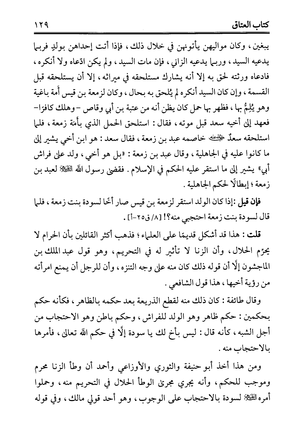 ومن هذا أخذ أبو حنيفة والثوري والأوزاعي وأحمد أن وطأ الزنا محرم وموجب للحكم، وأنه يجري مجرى الوطأ الحلال في التحريم منه، وحملوا أمره -عليه السلام- لسودة بالاحتجاب على الوجوب، وهو أحد قولي مالك، وفي قوله