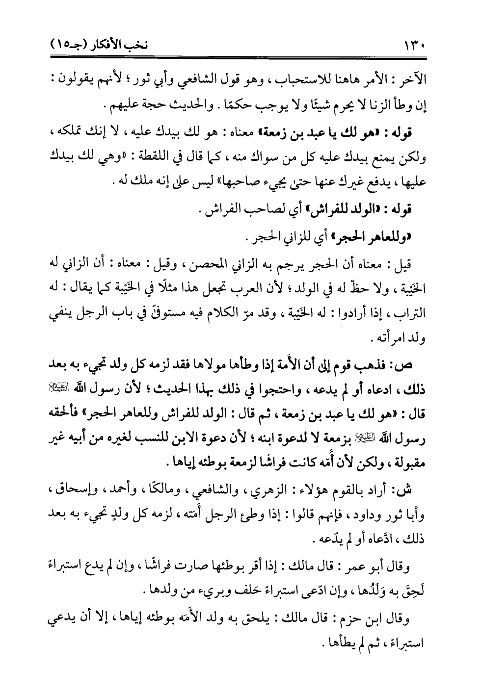 ص: فدهب قوم إلى أن الأَمة إذا وطأها مولاها فقد لزمه كل ولد تجيء به بعد ذلك، ادعاه أو لم يدعه، واحتجوا في ذلك بهذا الحديث؛ لأن رسول الله -عليه السلام- قال: "هو لك يا عبد بن زمعة، ثم قال: الولد للفراش وللعاهر الحجر" فألحقه رسول الله -عليه السلام- بزمعة لا لدعوة ابنه؛ لأن دعوة الابن للنسب لغيره من أبيه غير مقبولة، ولكن لأن أُمّه كانت فراشًا لزمعة بوطئه إياها.