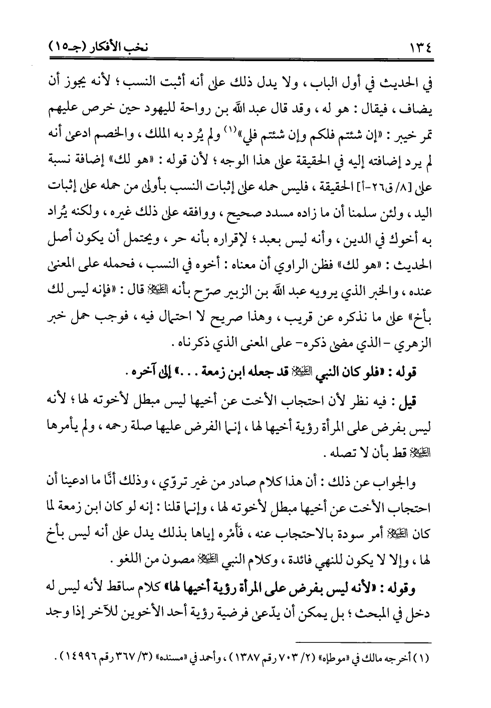 في الحديث في أول الباب، ولا يدل ذلك على أنه أثبت النسب؛ لأنه يجوز أن يضاف، فيقال: هو له، وقد قال عبد الله بن رواحة لليهود حين خرص عليهم تمر خيبر: "إن شئتم فلكم وإن شئتم فلي" (¬1) ولم يُرد به الملك، والخصم ادعى أنه لم يرد إضافته إليه في الحقيقة على هذا الوجه؛ لأن قوله: "هو لك" إضافة نسبة على الحقيقة، فليس حمله على إثبات النسب بأولى من حمله على إثبات اليد، ولئن سلمنا أن ما زاده مسدد صحيح، ووافقه على ذلك غيره، ولكنه يُراد به أخوك في الدين، وأنه ليس بعبد؛ لإقراره بأنه حر، ويحتمل أن يكون أصل الحديث: "هو لك" فظن الراوي أن معناه: أخوه في النسب، فحمله على المعنى عنده، والخبر الذي يرويه عبد الله بن الزبير صرّح بأنه -عليه السلام- قال: "فإنه ليس لك بأخ" على ما نذكره عن قريب، وهذا صريح لا احتمال فيه، فوجب حمل خبر الزهري -الذي مضى ذكره- على المعنى الذي ذكرناه.