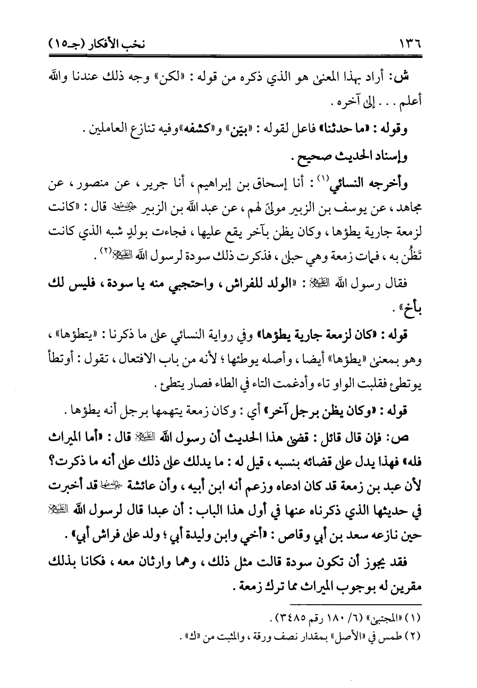 وأخرجه النسائي (¬1): أنا إسحاق بن إبراهيم، أنا جرير، عن منصور، عن مجاهد، عن يوسف بن الزبير مولىً لهم، عن عبد الله بن الزبير - رضي الله عنه - قال: "كانت لزمعة جارية يطؤها، وكان يظن بآخر يقع عليها، فجاءت بولدٍ شبه الذي كانت تَظُن به، فمات زمعة وهي حبلى، فذكرت ذلك سودة لرسول الله -عليه السلام- (¬2).
