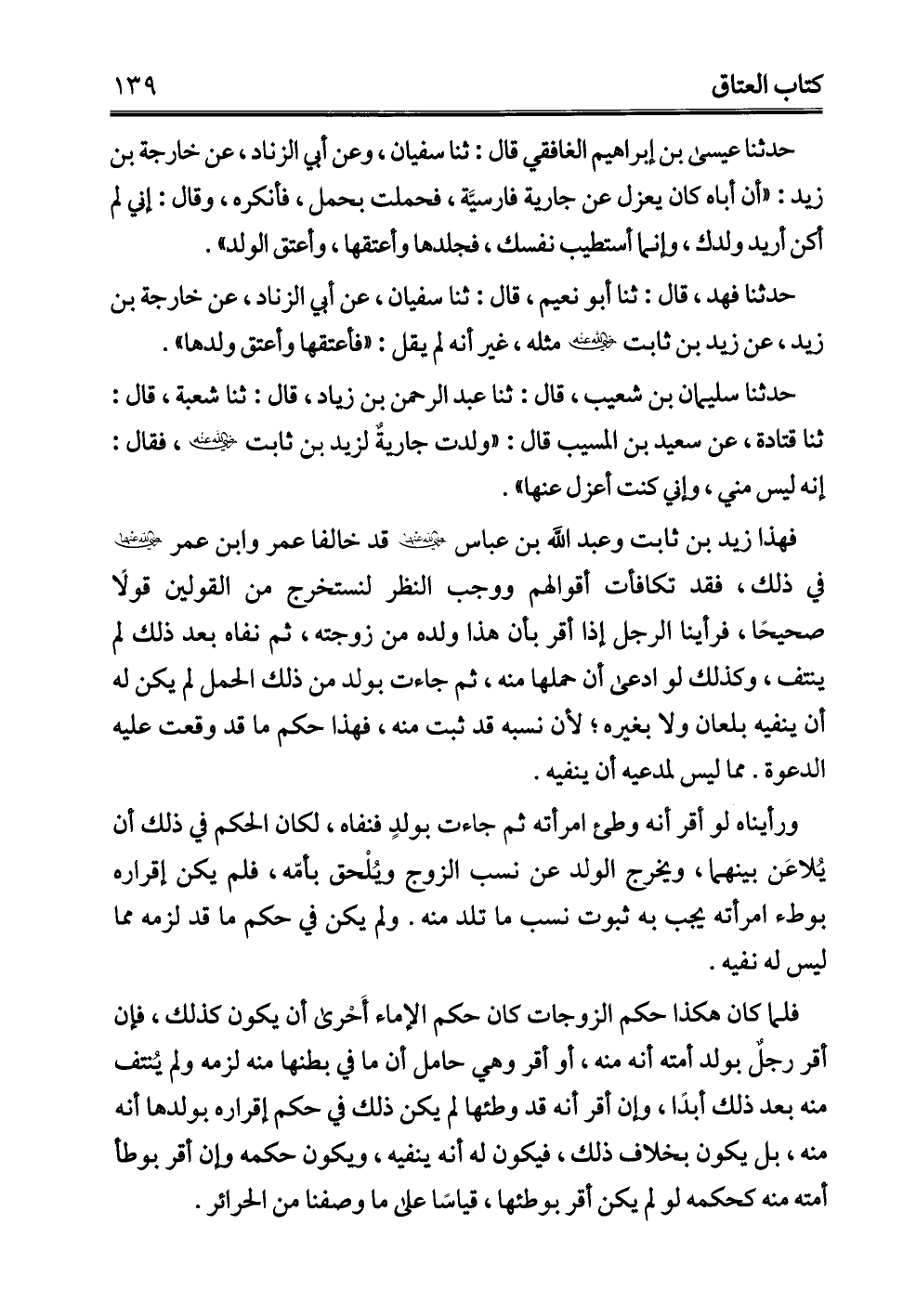 حدثنا سليمان بن شعيب، قال: ثنا عبد الرحمن بن زياد، قال: ثنا شعبة، قال: ثنا قتادة، عن سعيد بن المسيب قال: "ولدت جاريةٌ لزيد بن ثابت - رضي الله عنه -, فقال: إنه ليس مني، وإني كنت أعزل عنها".