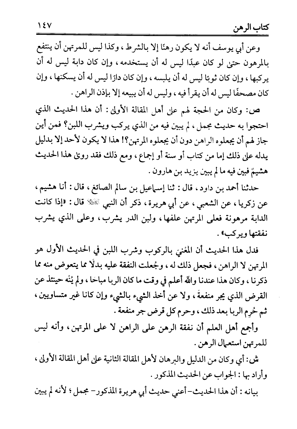 ص: وكان من الحجة لهم على أهل المقالة الأولى: أن هذا الحديث الذي احتجوا به حديث مجمل, لم يبين فيه من الذي يركب ويشرب اللبن؟ فمن أين جاز لهم أن يجعلوه الراهن دون أن يجعلوه المرتهن؟! هذا لا يكون لأحد إلا بدليل يدله على ذلك إما من كتاب أو سنة أو إجماع، ومع ذلك فقد روى هذا الحديث هشيم فبين فيه ما لم يبين يزيد بن هارون.