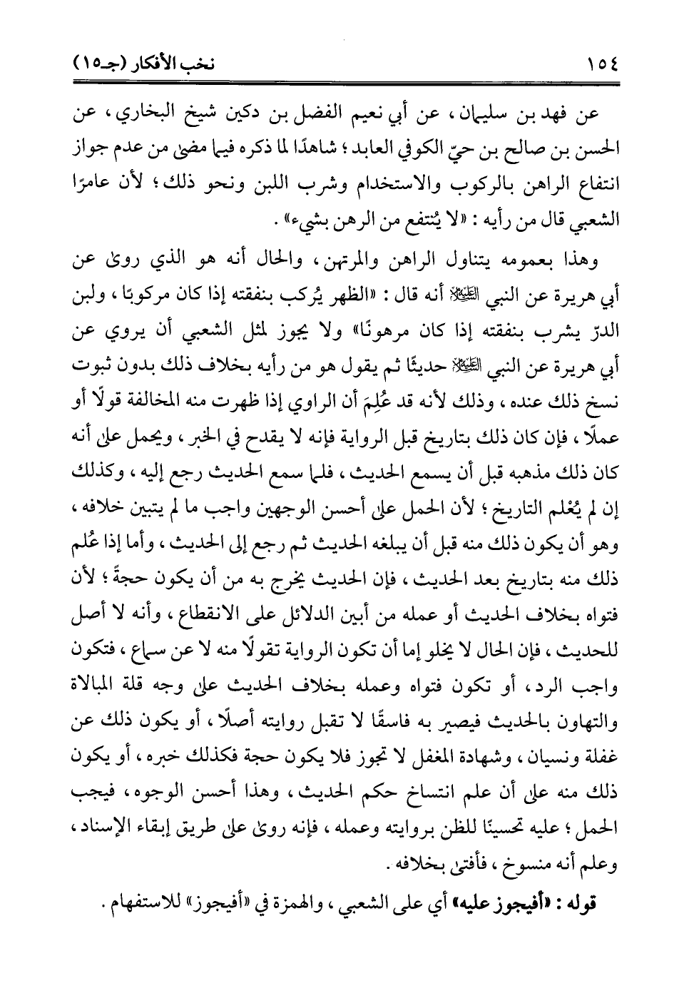 عن فهد بن سليمان، عن أبي نعيم الفضل بن دكين شيخ البخاري، عن الحسن بن صالح بن حيّ الكوفي العابد؛ شاهدًا لما ذكره فيما مضى من عدم جواز انتفاع الراهن بالركوب والاستخدام وشرب اللبن ونحو ذلك؛ لأن عامرًا الشعبي قال من رأيه: "لا يُنتفع من الرهن بشيء".