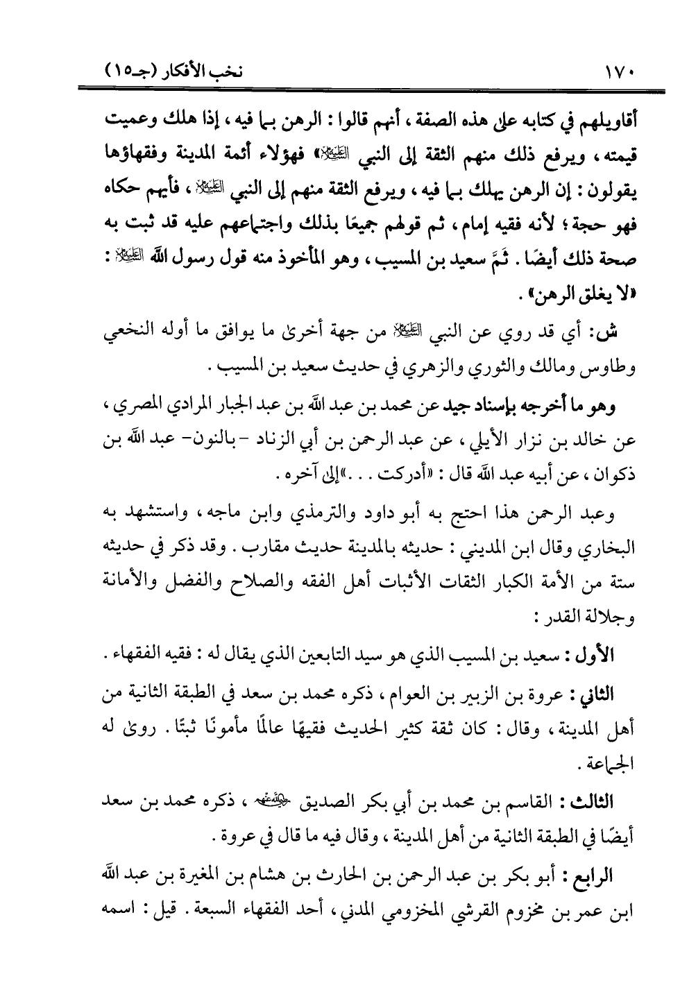 أقاويلهم في كتابه على هذه الصفة، أنهم قالوا: الرهن بما فيه، إذا هلك وعميت قيمته، ويرفع ذلك منهم الثقة إلى النبي -عليه السلام-" فهؤلاء أئمة المدينة وفقهاؤها يقولون: إن الرهن يهلك بما فيه، ويرفع الثقة منهم إلى النبي -عليه السلام-، فأيهم حكاه فهو حجة؛ لأنه فقيه إمام، ثم قولهم جميعًا بذلك واجتماعهم عليه قد ثبت به صحة ذلك أيضًا. ثَمَّ سعيد بن المسيب، وهو المأخوذ منه قول رسول الله -عليه السلام-: "لا يغلق الرهن".