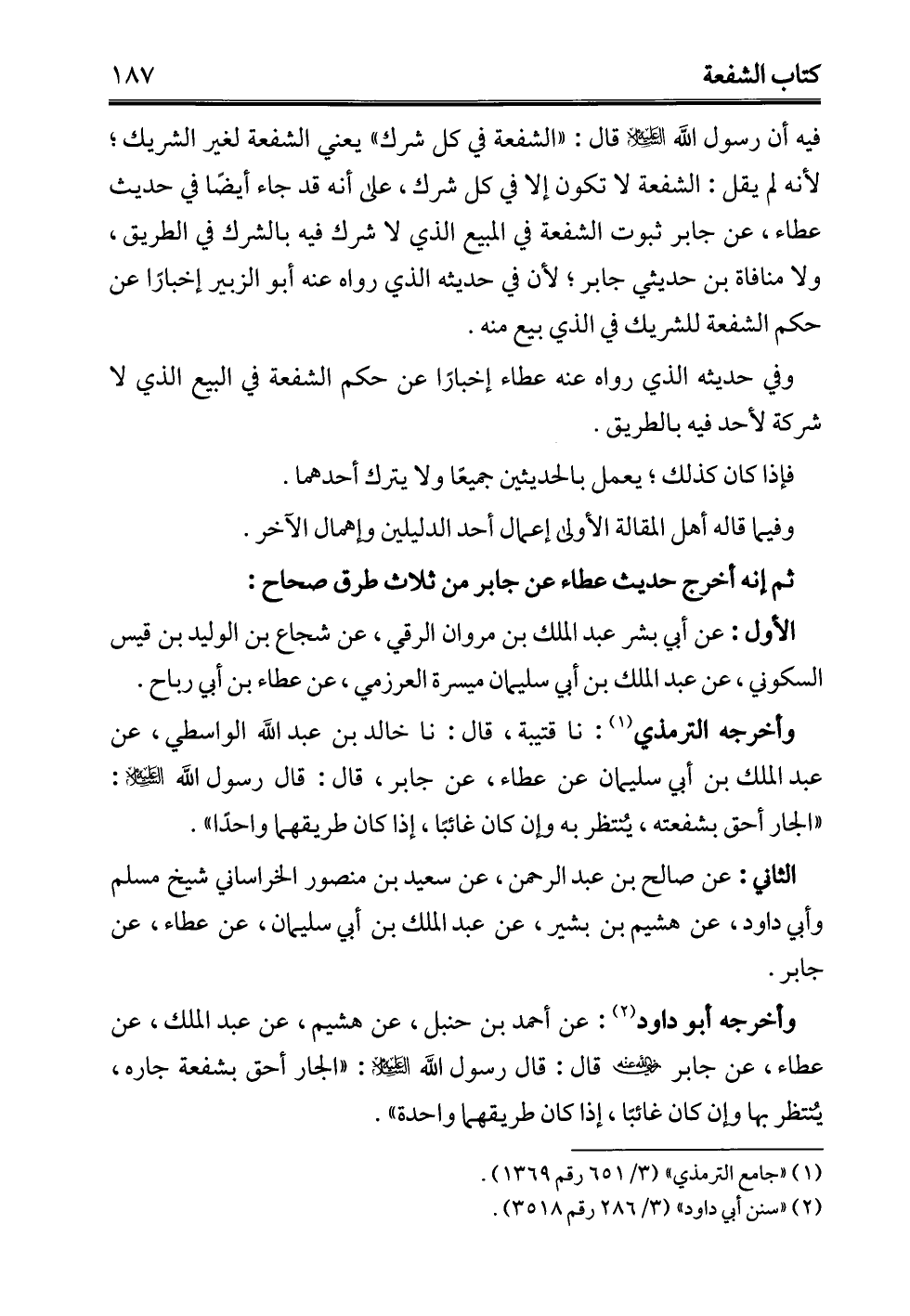 فيه أن رسول الله -عليه السلام- قال: "الشفعة في كل شرك" يعني الشفعة لغير الشريك؛ لأنه لم يقل: الشفعة لا تكون إلا في كل شرك، على أنه قد جاء أيضًا في حديث عطاء، عن جابر ثبوت الشفعة في المبيع الذي لا شرك فيه بالشرك في الطريق، ولا منافاة بين حديثي جابر؛ لأن في حديثه الذي رواه عنه أبو الزبير إخبارًا عن حكم الشفعة للشريك في الذي بيع منه.