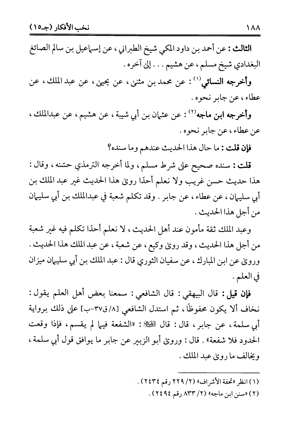 قلت: سنده صحيح على شرط مسلم، ولما أخرجه الترمذي حسّنه، وقال: هذا حديث حسن غريب ولا نعلم أحدًا روى هذا الحديث غير عبد الملك بن أبي سليمان، عن عطاء، عن جابر. وقد تكلم شعبة في عبد الملك بن أبي سليمان من أجل هذا الحديث.