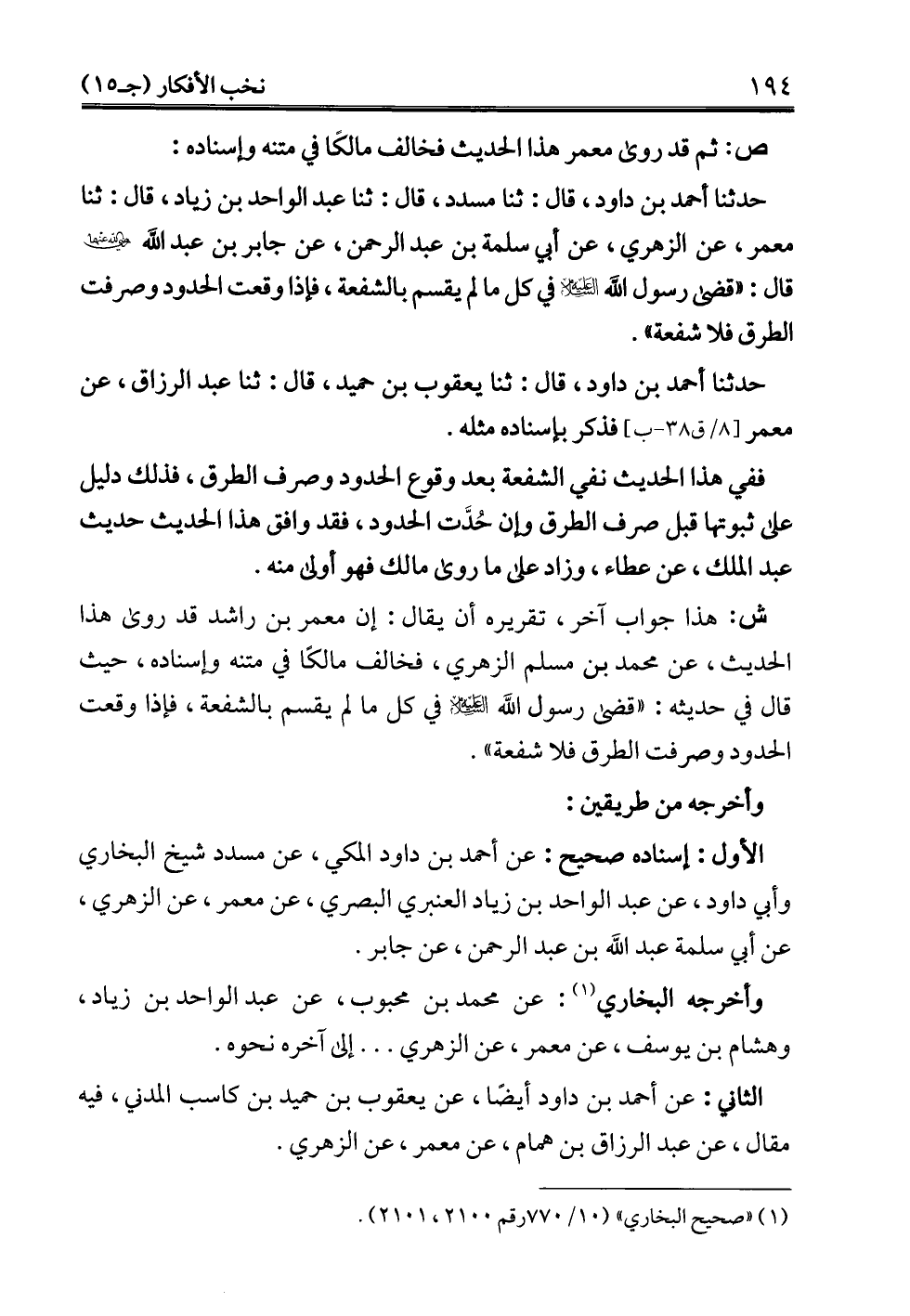 ش: هذا جواب آخر، تقريره أن يقال: إن معمر بن راشد قد روى هذا الحديث، عن محمَّد بن مسلم الزهري، فخالف مالكًا في متنه وإسناده، حيث قال في حديثه: "قضى رسول الله -عليه السلام- في كل ما لم يقسم بالشفعة، فإذا وقعت الحدود وصرفت الطرق فلا شفعة".