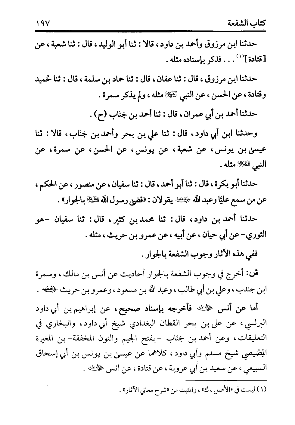 ش: أخرج في وجوب الشفعة بالجوار أحاديث عن أنس بن مالك، وسمرة ابن جندب، وعلي بن أبي طالب، وعبد الله بن مسعود، وعمرو بن حريث - رضي الله عنهم -.