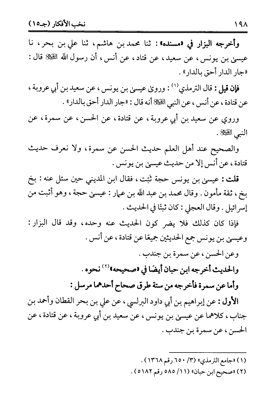 فإذا كان كذلك فلا يضر كون الحديث عنه وحده، وقد قال البزار: وعيسى بن يونس جمع الحديثين جميعًا عن قتادة، عن أنس.