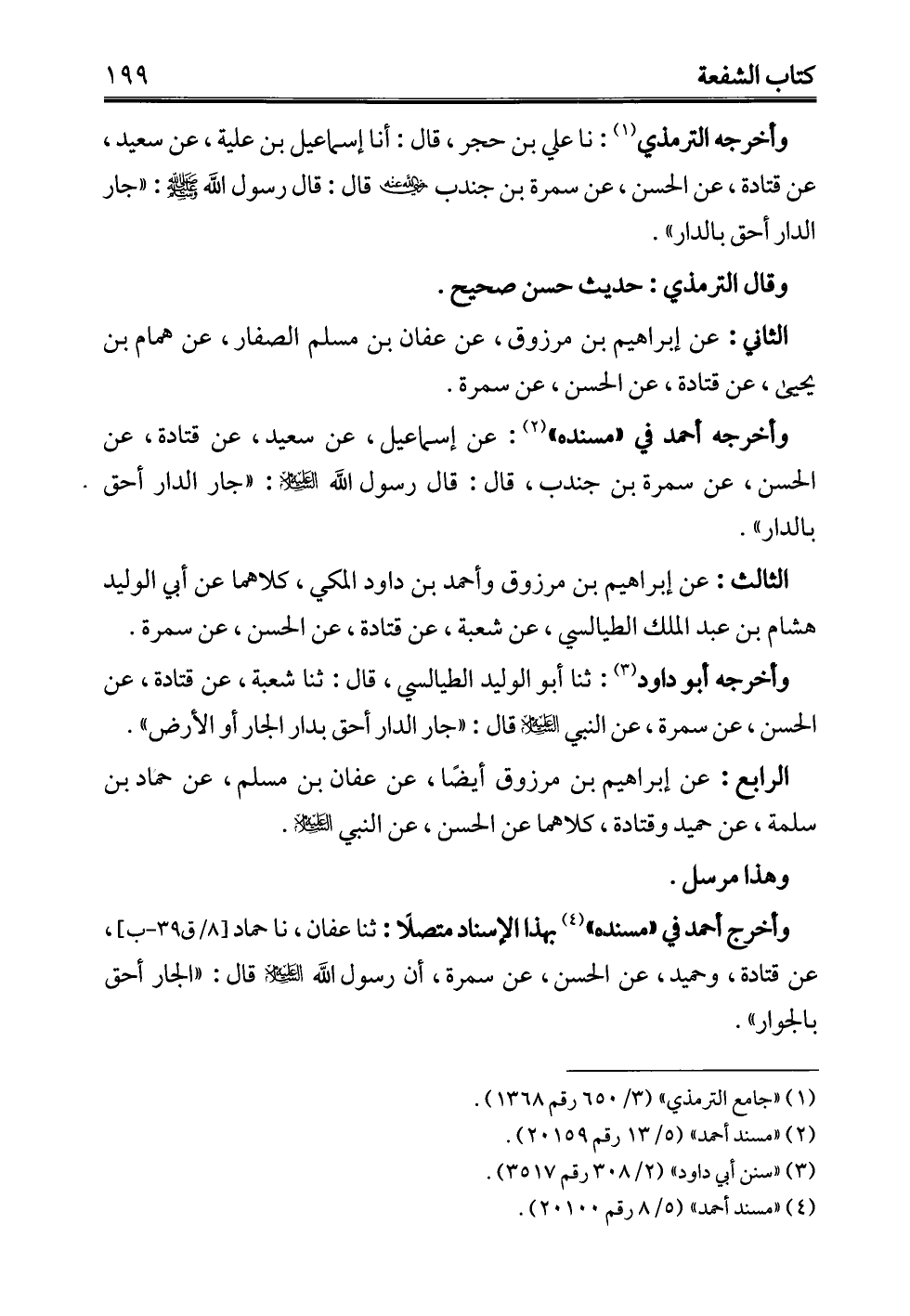 وأخرج أحمد في "مسنده" (¬4) بهذا الإسناد متصلًا: ثنا عفان، نا حماد، عن قتادة، وحميد، عن الحسن، عن سمرة، أن رسول الله -عليه السلام- قال: "الجار أحق بالجوار".