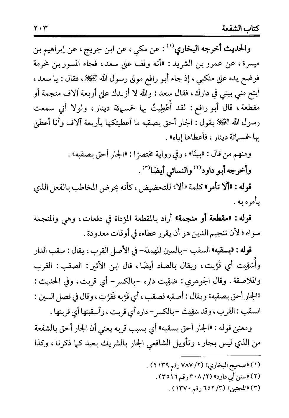 والحديث أخرجه البخاري (¬1): عن مكي، عن ابن جريج، عن إبراهيم بن ميسرة، عن عمرو بن الشريد: "أنه وقف على سعد، فجاء المسور بن مخرمة فوضع يده على منكبي، إذ جاء أبو رافع مولى رسول الله -عليه السلام-، فقال: يا سعد، ابتع مني بيتي في دارك، فقال سعد: والله لا أزيدك على أربعة آلاف منجمة أو مقطعة، قال أبو رافع: لقد أُعْطِيتُ بها خمسمائة دينار، ولولا أني سمعت رسول الله -عليه السلام- يقول: الجار أحق بصقبه ما أعطيتكها بأربعة آلاف وأنا أعطى بها خمسمائة دينار، فأعطاها إياه".