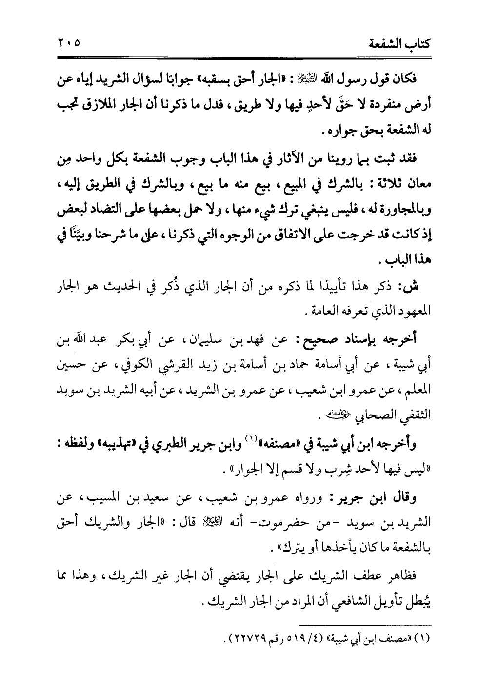 وقال ابن جرير: ورواه عمرو بن شعيب، عن سعيد بن المسيب، عن الشريد بن سويد -من حضرموت- أنه -عليه السلام- قال: "الجار والشريك أحق بالشفعة ما كان يأخذها أو يترك".