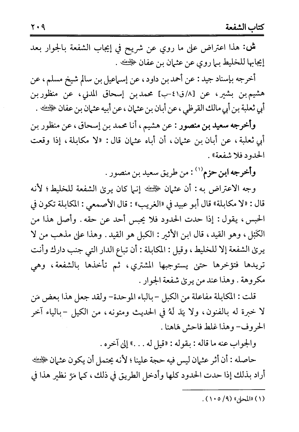 وأخرجه سعيد بن منصور: عن هشيم، أنا محمد بن إسحاق، عن منظور بن أبي ثعلبة، عن أبان بن عثمان، أن أباه عثمان قال: "لا مكابلة، إذا وقعت الحدود فلا شفعة".
