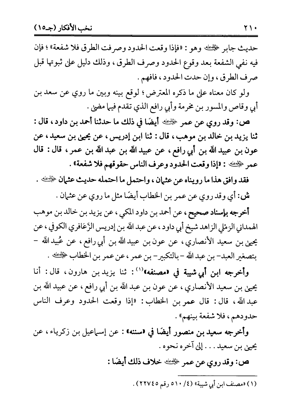 وأخرجه ابن أبي شيبة في "مصنفه" (¬1): ثنا يزيد بن هارون، قال: أنا يحيى بن سعيد الأنصاري، عن عون بن عبد الله بن أبي رافع، عن عبيد الله بن عبد الله، قال: قال عمر بن الخطاب: "إذا وقعت الحدود وعرف الناس حدودهم، فلا شفعة بينهم".