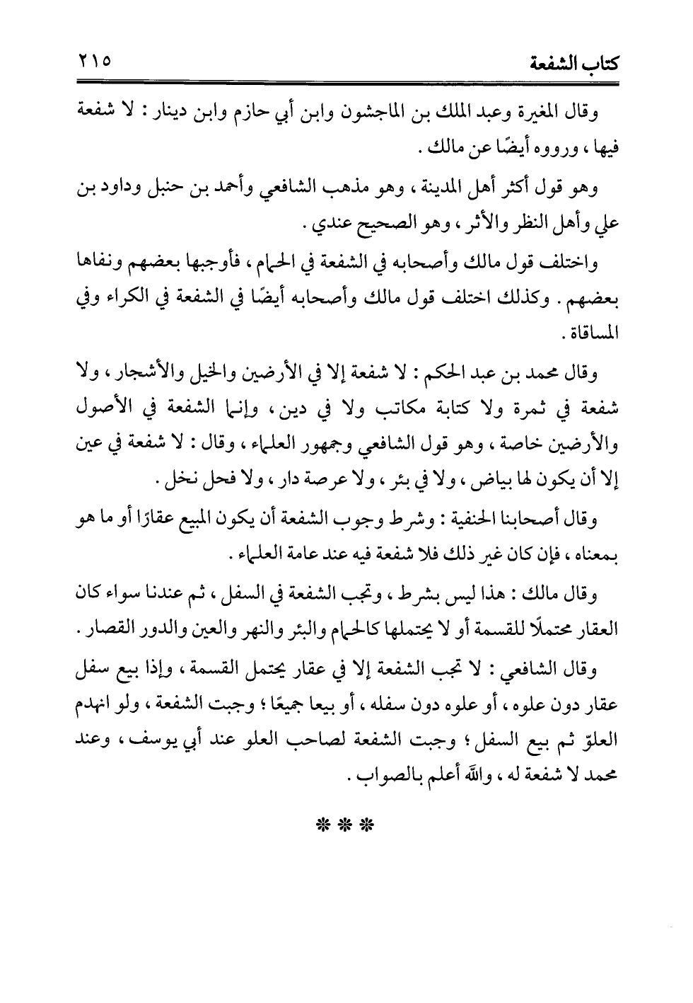 واختلف قول مالك وأصحابه في الشفعة في الحمام، فأوجبها بعضهم ونفاها بعضهم. وكذلك اختلف قول مالك وأصحابه أيضًا في الشفعة في الكراء وفي المساقاة.
