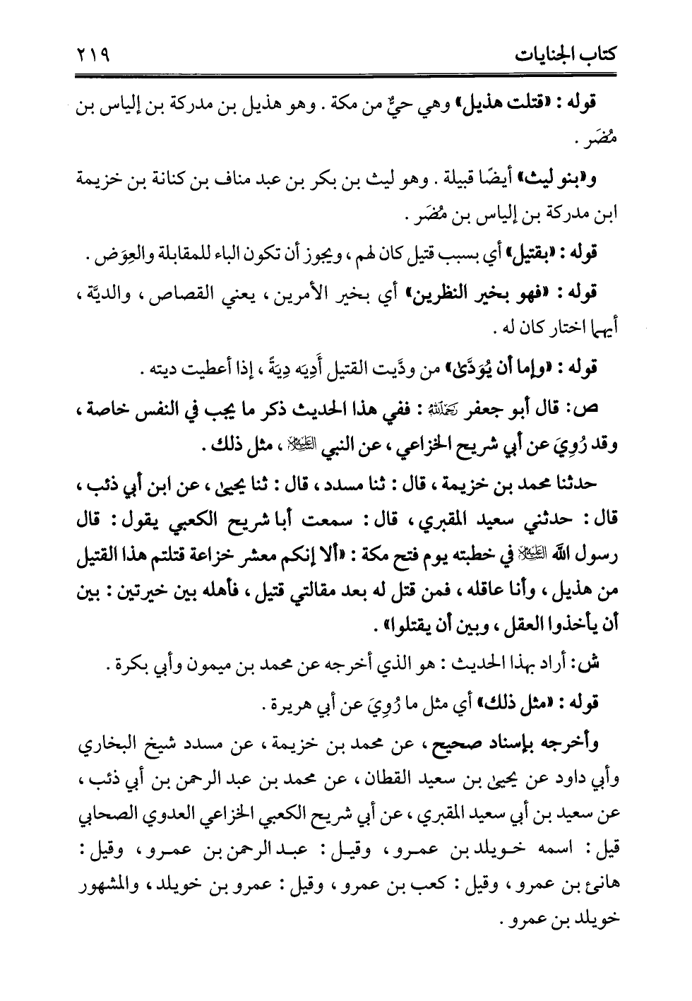 حدثنا محمد بن خزيمة، قال: ثنا مسدد، قال: ثنا يحيى، عن ابن أبي ذئب، قال: حدثني سعيد المقبري، قال: سمعت أبا شريح الكعبي يقول: قال رسول الله -عليه السلام- في خطبته يوم فتح مكة: "ألا إنكم معشر خزاعة قتلتم هذا القتيل من هذيل، وأنا عاقله، فمن قتل له بعد مقالتي قتيل، فأهله بين خيرتين: بين أن يأخذوا العقل، وبين أن يقتلوا".