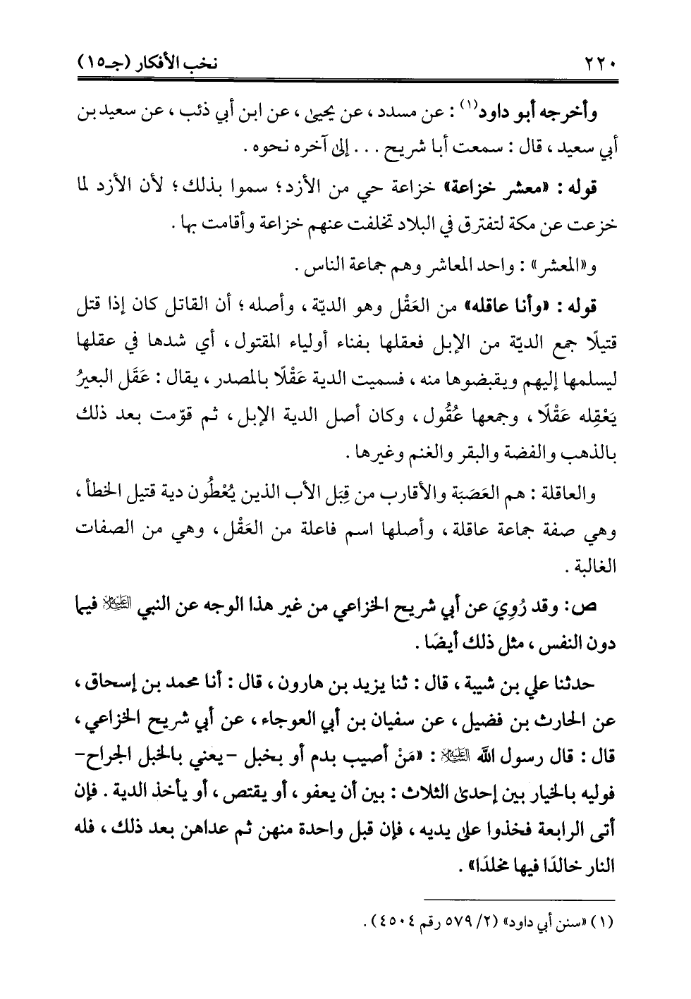 حدثنا علي بن شيبة، قال: ثنا يزيد بن هارون، قال: أنا محمد بن إسحاق، عن الحارث بن فضيل، عن سفيان بن أبي العوجاء، عن أبي شريح الخزاعي، قال: قال رسول الله -عليه السلام-: "مَنْ أصيب بدم أو بخبل -يعني بالخبل الجراح- فوليه بالخيار بين إحدى الثلاث: بين أن يعفو، أو يقتص، أو يأخذ الدية. فإن أتى الرابعة فخذوا على يديه، فإن قبل واحدة منهن ثم عداهن بعد ذلك، فله النار خالدًا فيها مخلدًا".