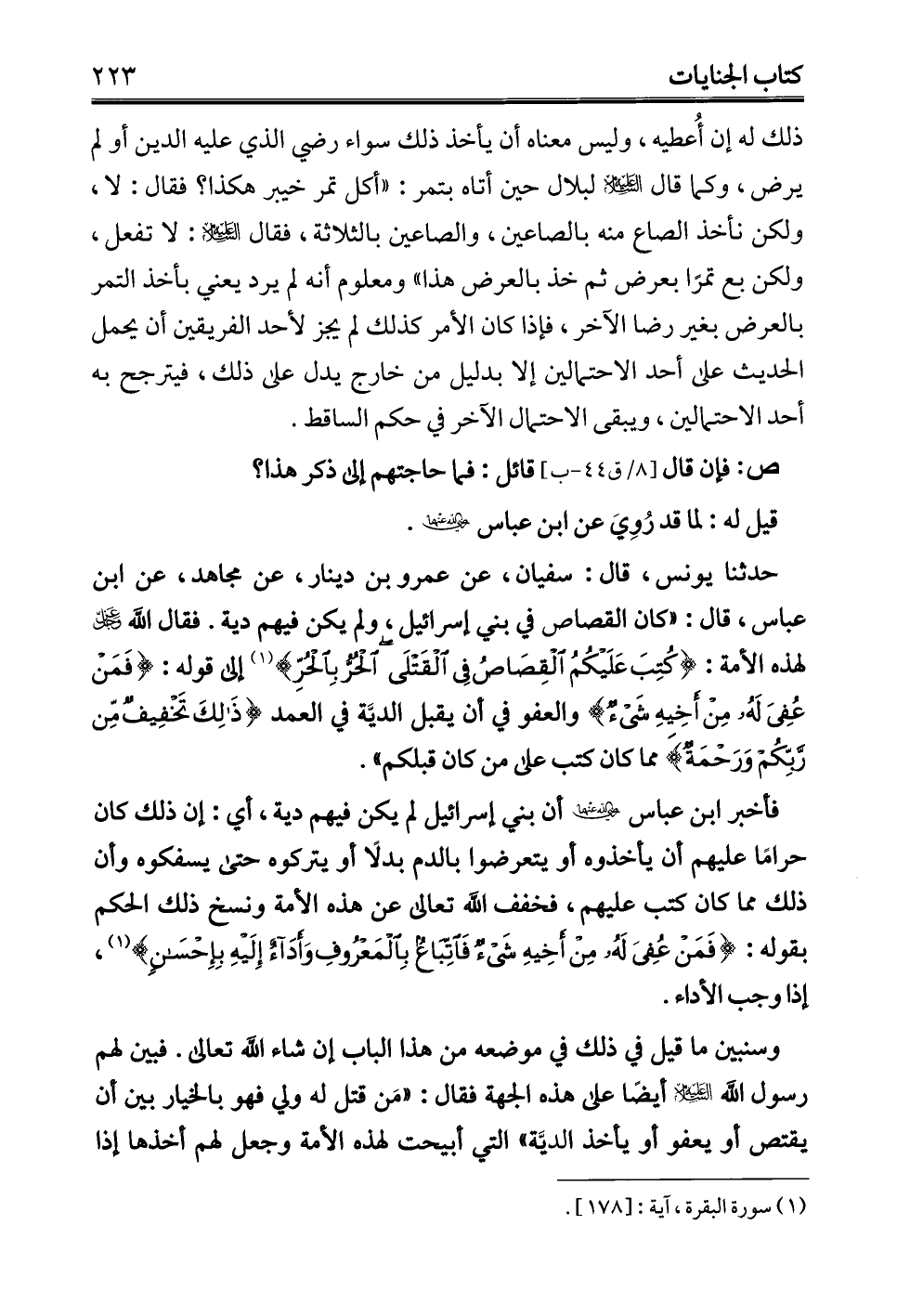 فأخبر ابن عباس -رضي الله عنهما- أن بني إسرائيل لم يكن فيهم دية، أي: إن ذلك كان حرامًا عليهم أن يأخذوه أو يتعرضوا بالدم بدلًا أو يتركوه حتى يسفكوه وأن ذلك مما كان كتب عليهم، فخفف الله تعالى عن هذه الأمة ونسخ ذلك الحكم بقوله: {فَمَنْ عُفِيَ لَهُ مِنْ أَخِيهِ شَيْءٌ فَاتِّبَاعٌ بِالْمَعْرُوفِ وَأَدَاءٌ إِلَيْهِ بِإِحْسَانٍ} (1)، إذا وجب الأداء.