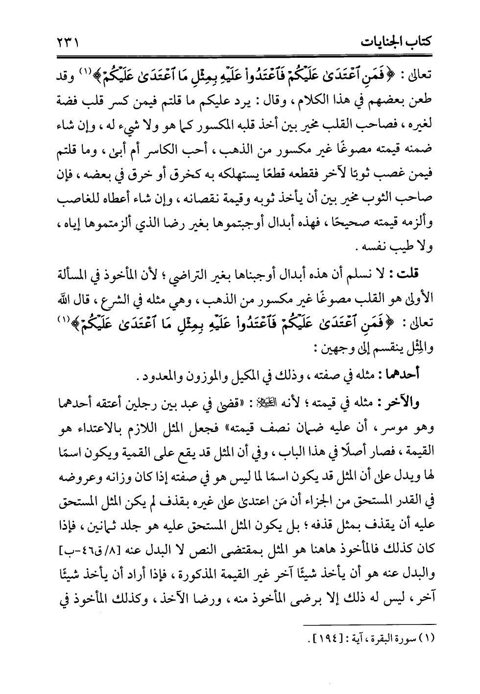 قلت: لا نسلم أن هذه أبدال أوجبناها بغير التراضي؛ لأن المأخوذ في المسألة الأولى هو القلب مصوغًا غير مكسور من الذهب، وهي مثله في الشرع، قال الله تعالى: {فَمَنِ اعْتَدَى عَلَيْكُمْ فَاعْتَدُوا عَلَيْهِ بِمِثْلِ مَا اعْتَدَى عَلَيْكُمْ} (1) والمِثْل ينقسم إلى وجهين: