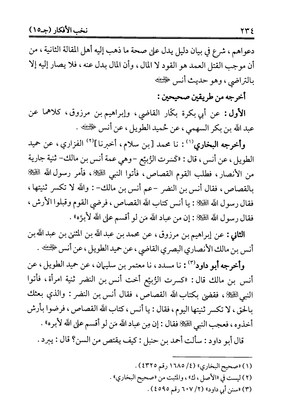 دعواهم، شرع في بيان دليل يدل على صحة ما ذهب إليه أهل المقالة الثانية، من أن موجب القتل العمد هو القود لا المال، وأن المال بدل عنه، فلا يصار إليه إلا بالتراضي، وهو حديث أنس - رضي الله عنه -.