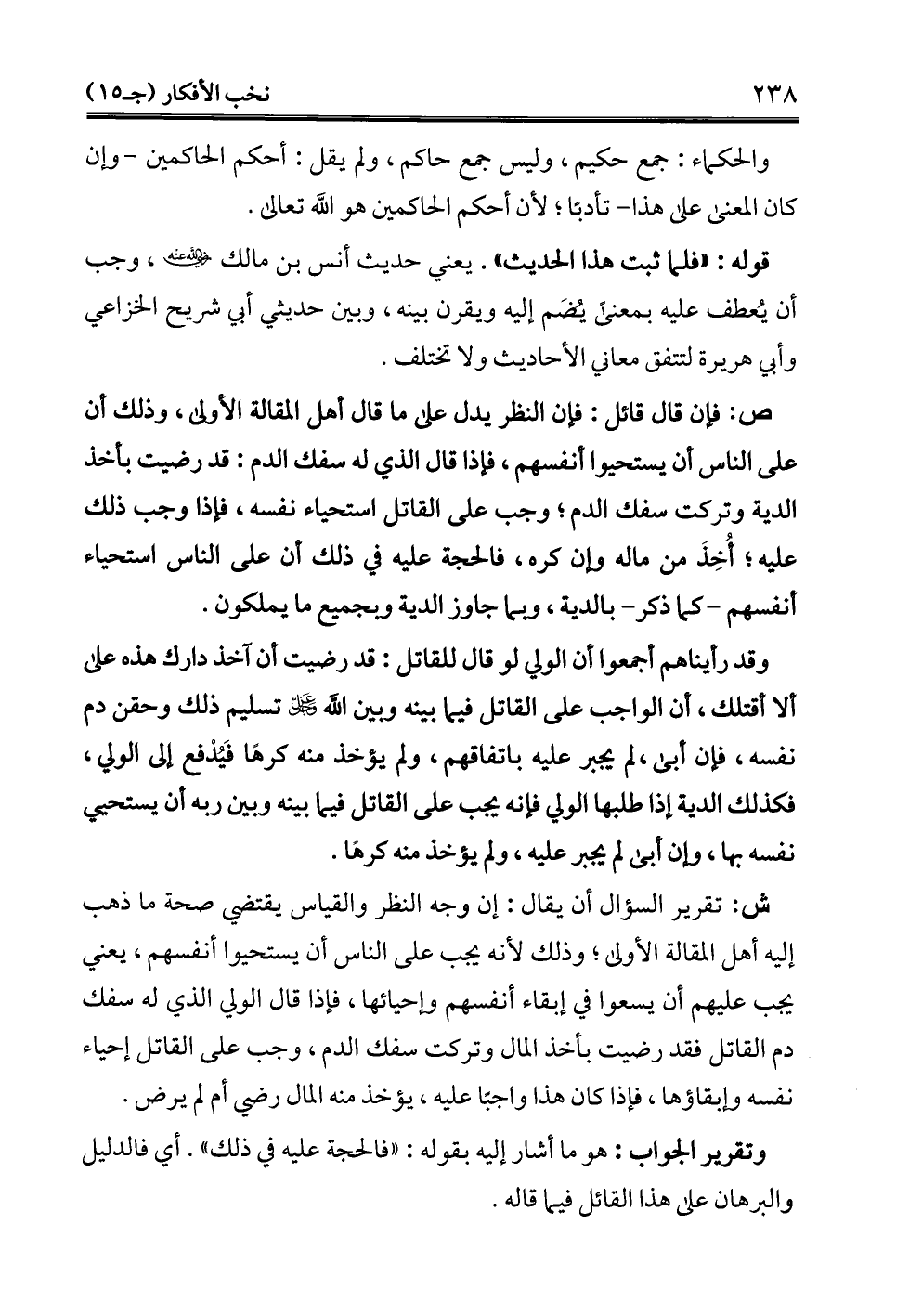 ش: تقرير السؤال أن يقال: إن وجه النظر والقياس يقتضي صحة ما ذهب إليه أهل المقالة الأولى؛ وذلك لأنه يجب على الناس أن يستحيوا أنفسهم، يعني يجب عليهم أن يسعوا في إبقاء أنفسهم وإحيائها، فإذا قال الولي الذي له سفك دم القاتل فقد رضيت بأخذ المال وتركت سفك الدم، وجب على القاتل إحياء نفسه وإبقاؤها، فإذا كان هذا واجبًا عليه، يؤخذ منه المال رضي أم لم يرض.
