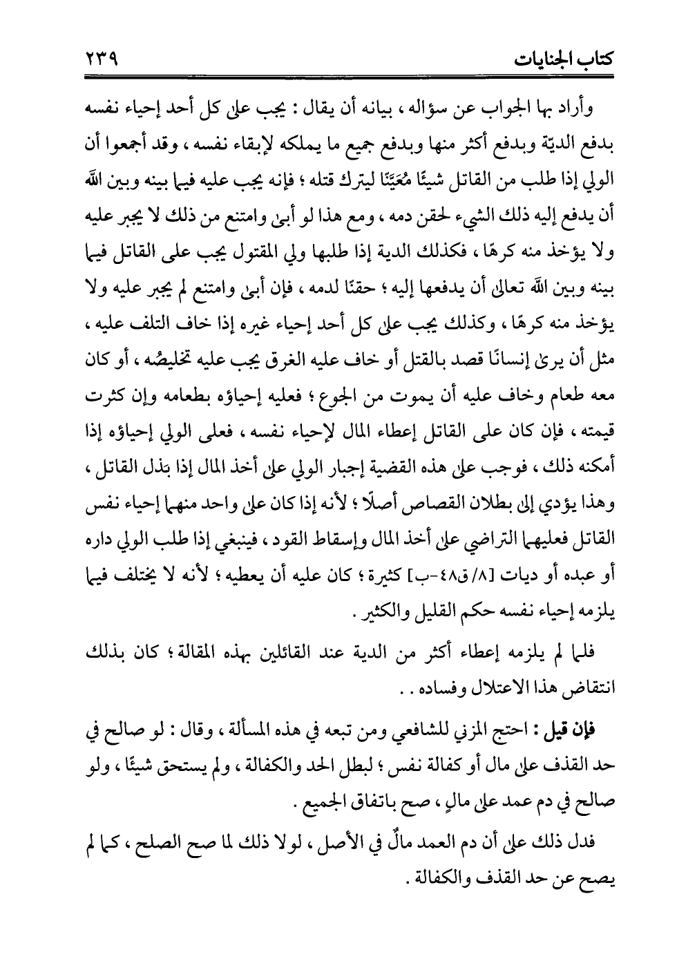 وأراد بها الجواب عن سؤاله، بيانه أن يقال: يجب على كل أحد إحياء نفسه بدفع الديّة وبدفع أكثر منها وبدفع جميع ما يملكه لإبقاء نفسه، وقد أجمعوا أن الولي إذا طلب من القاتل شيئًا مُعَيَّنًا ليترك قتله؛ فإنه يجب عليه فيما بينه وبين الله أن يدفع إليه ذلك الشيء لحقن دمه، ومع هذا لو أبى وامتنع من ذلك لا يجبر عليه ولا يؤخذ منه كرهًا، فكذلك الدية إذا طلبها ولي المقتول يجب على القاتل فيما بينه وبين الله تعالى أن يدفعها إليه؛ حقنًا لدمه، فإن أبى وامتنع لم يجبر عليه ولا يؤخذ منه كرهًا، وكذلك يجب على كل أحد إحياء غيره إذا خاف التلف عليه، مثل أن يرى إنسانًا قصد بالقتل أو خاف عليه الغرق يجب عليه تخليصُه، أو كان معه طعام وخاف عليه أن يموت من الجوع، فعليه إحياؤه بطعامه وإن كثرت قيمته، فإن كان على القاتل إعطاء المال لإحياء نفسه، فعلى الولي إحياؤه إذا أمكنه ذلك، فوجب على هذه القضية إجبار الولي على أخذ المال إذا بَذل القاتل، وهذا يؤدي إلى بطلان القصاص أصلًا؛ لأنه إذا كان على واحد منهما إحياء نفس القاتل فعليهما التراضي على أخذ المال وإسقاط القود، فينبغي إذا طلب الولي داره أو عبده أو ديات كثيرة؛ كان عليه أن يعطيه؛ لأنه لا يختلف فيما يلزمه إحياء نفسه حكم القليل والكثير.
