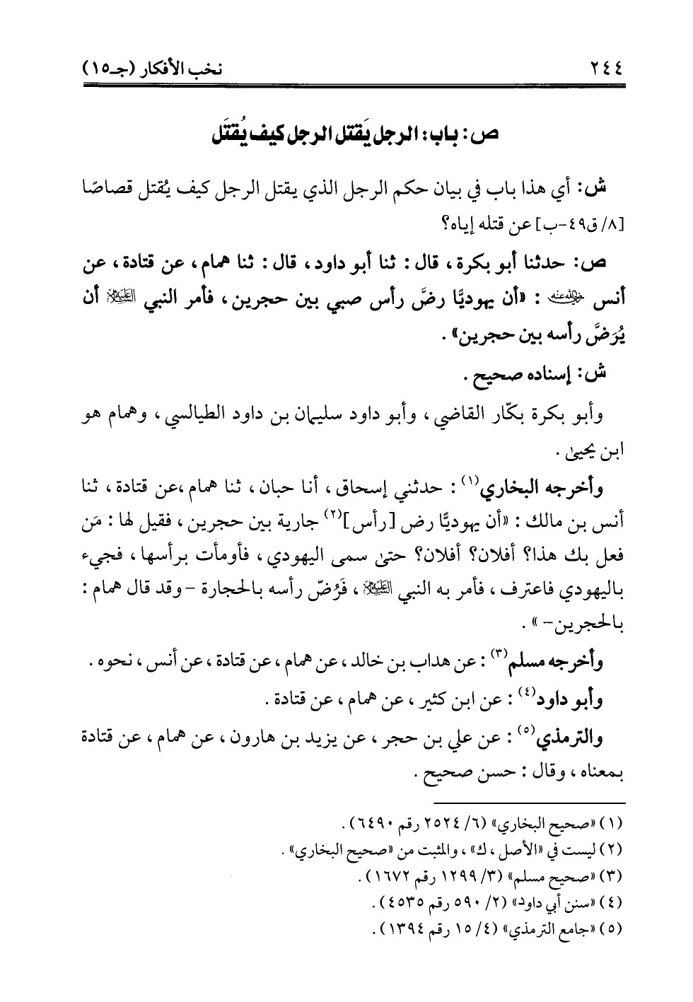 ص: حدثنا أبو بكرة، قال: ثنا أبو داود، قال: ثنا همام، عن قتادة، عن أنس - رضي الله عنه -: "أن يهوديًّا رضَّ رأس صبي بين حجرين، فأمر النبي -عليه السلام- أن يُرَضَّ رأسه بين حجرين".
