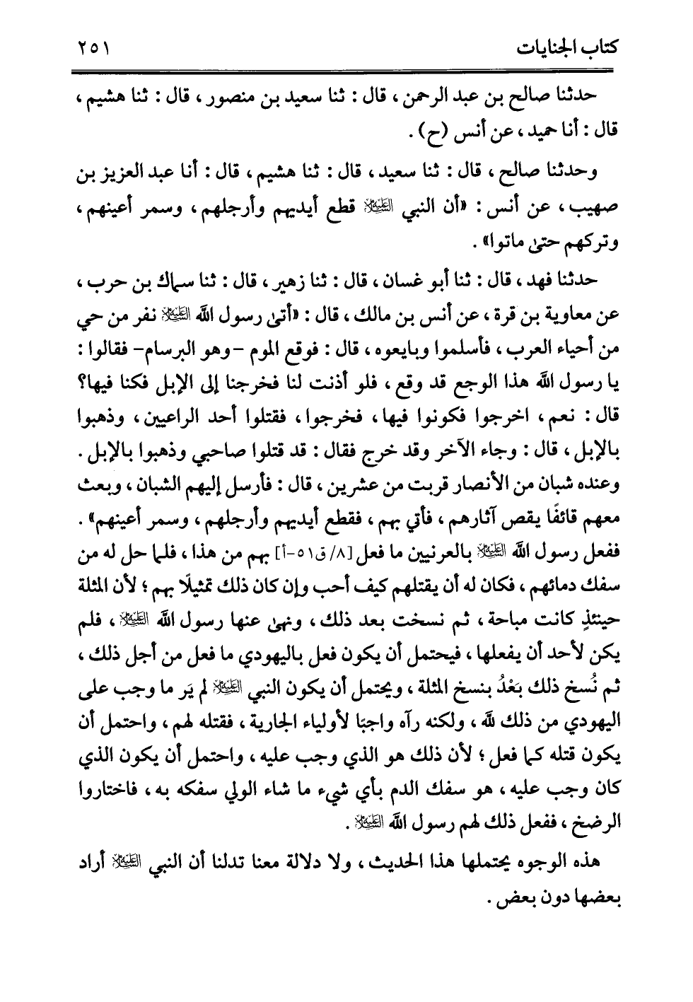 وحدثنا صالح، قال: ثنا سعيد، قال: ثنا هشيم، قال: أنا عبد العزيز بن صهيب، عن أنس: "أن النبي -عليه السلام- قطع أيديهم وأرجلهم، وسمر أعينهم، وتركهم حتى ماتوا".