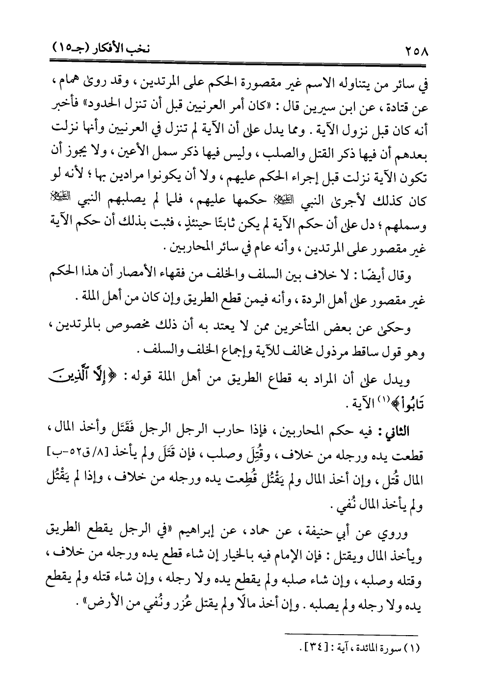 وقال أيضًا: لا خلاف بين السلف والخلف من فقهاء الأمصار أن هذا الحكم غير مقصور على أهل الردة، وأنه فيمن قطع الطريق وإن كان من أهل الملة.
