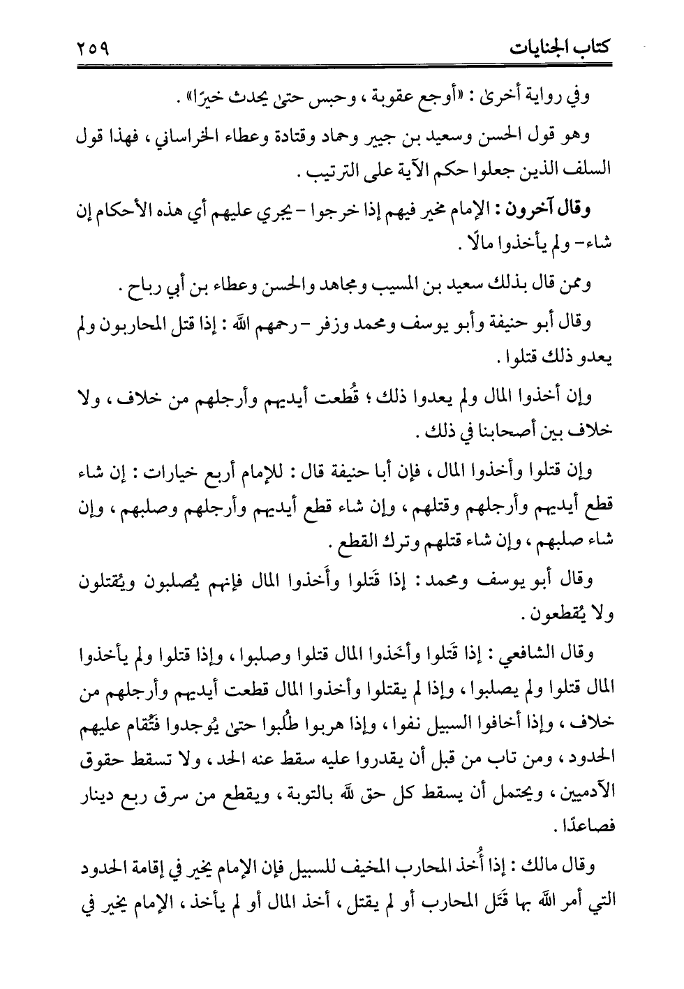 وإن قتلوا وأخذوا المال، فإن أبا حنيفة قال: للإمام أربع خيارات: إن شاء قطع أيديهم وأرجلهم وقتلهم، وإن شاء قطع أيديهم وأرجلهم وصلبهم، وإن شاء صلبهم، وإن شاء قتلهم وترك القطع.