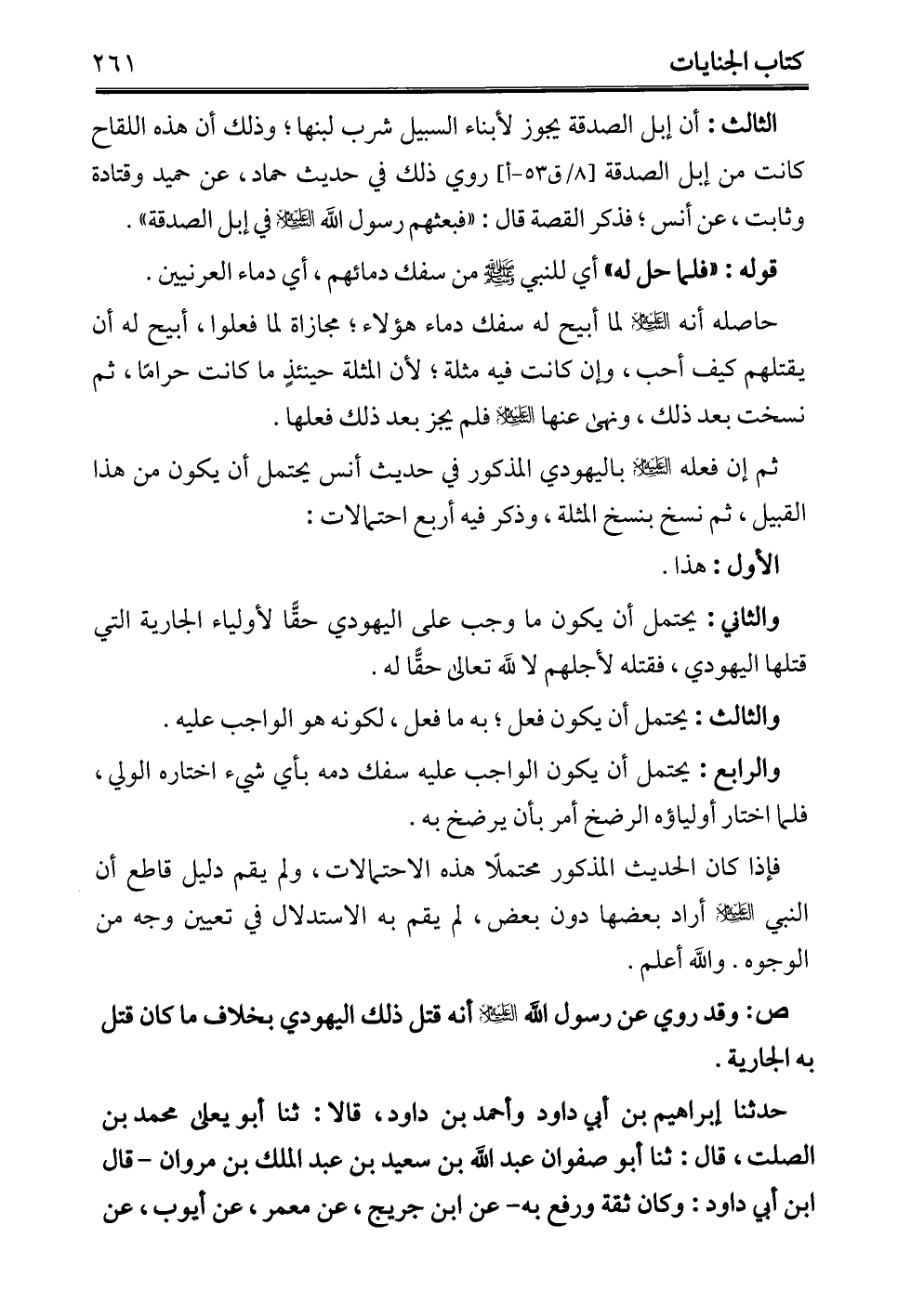 ثم إن فعله -عليه السلام- باليهودي المذكور في حديث أنس يحتمل أن يكون من هذا القبيل، ثم نسخ بنسخ المثلة، وذكر فيه أربع احتمالات: