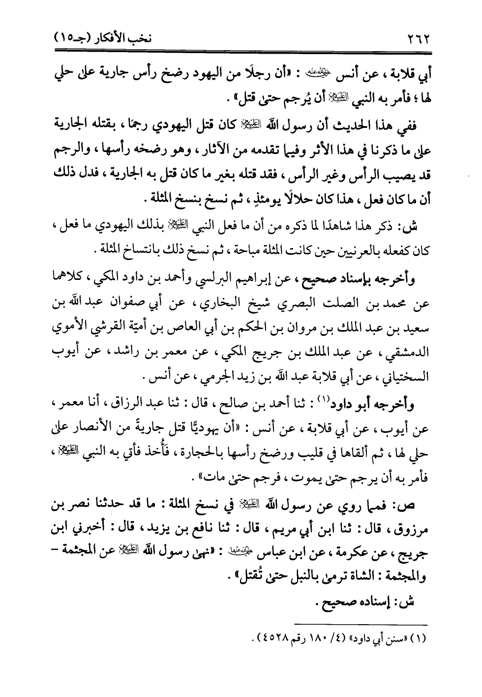 ففي هذا الحديث أن رسول الله -عليه السلام- كان قتل اليهودي رجمًا، بقتله الجارية على ما ذكرنا في هذا الأثر وفيما تقدمه من الآثار، وهو رضخه رأسها، والرجم قد يصيب الرأس وغير الرأس، فقد قتله بغير ما كان قتل به الجارية، فدل ذلك أن ما كان فعل، هذا كان حلالًا يومئذٍ، ثم نسخ بنسخ المثلة.