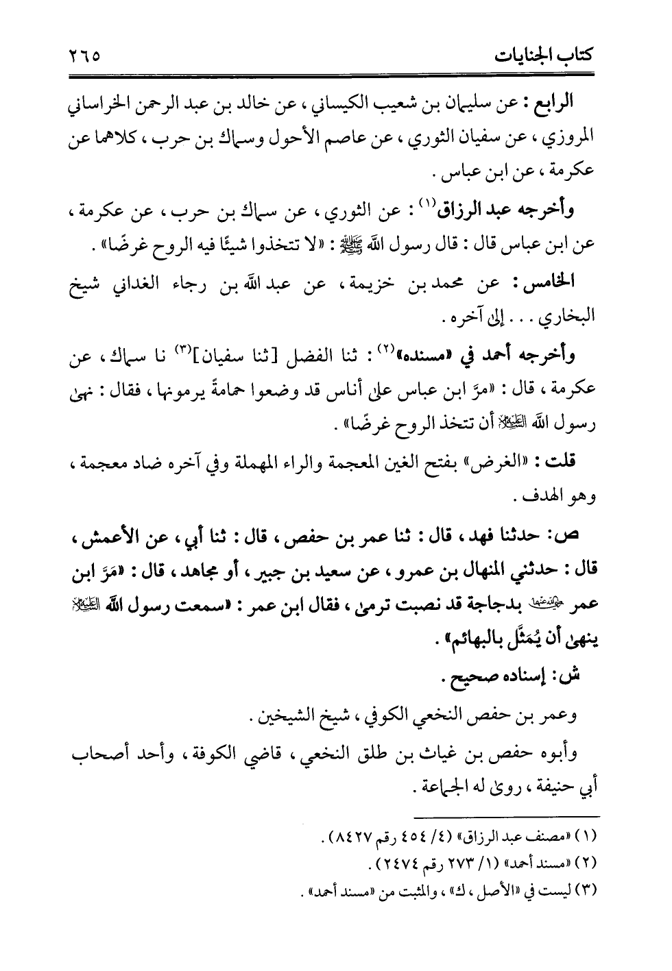 وأخرجه عبد الرزاق (¬1): عن الثوري، عن سماك بن حرب، عن عكرمة، عن ابن عباس قال: قال رسول الله - صلى الله عليه وسلم -: "لا تتخذوا شيئًا فيه الروح غرضًا".