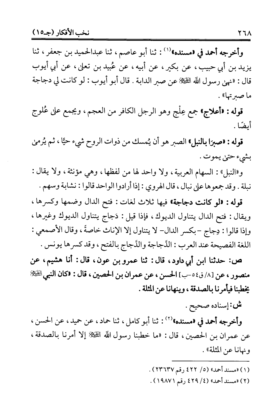 وأخرجه أحمد في "مسنده" (¬1): ثنا أبو عاصم، ثنا عبد الحميد بن جعفر، ثنا يزيد بن أبي حبيب، عن بكير، عن أبيه، عن عُبيد بن تعلى، عن أبي أيوب قال: "نهى رسول الله -عليه السلام- عن صبر الدابة. قال أبو أيوب: لو كانت لي دجاجة ما صبرتها".