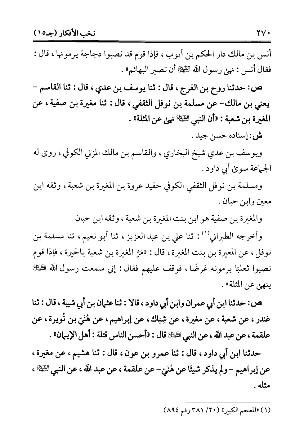 وأخرجه الطبراني (¬1): ثنا علي بن عبد العزيز، ثنا أبو نعيم، ثنا مسلمة بن نوفل، عن المغيرة بن بنت المغيرة، قال: "مَرَّ المغيرة بن شعبة بالحيرة، فإذا قوم نصبوا ثعلبًا يرمونه غرضًا، فوقف عليهم فقال: إني سمعت رسول الله -عليه السلام- ينهى عن المثلة".