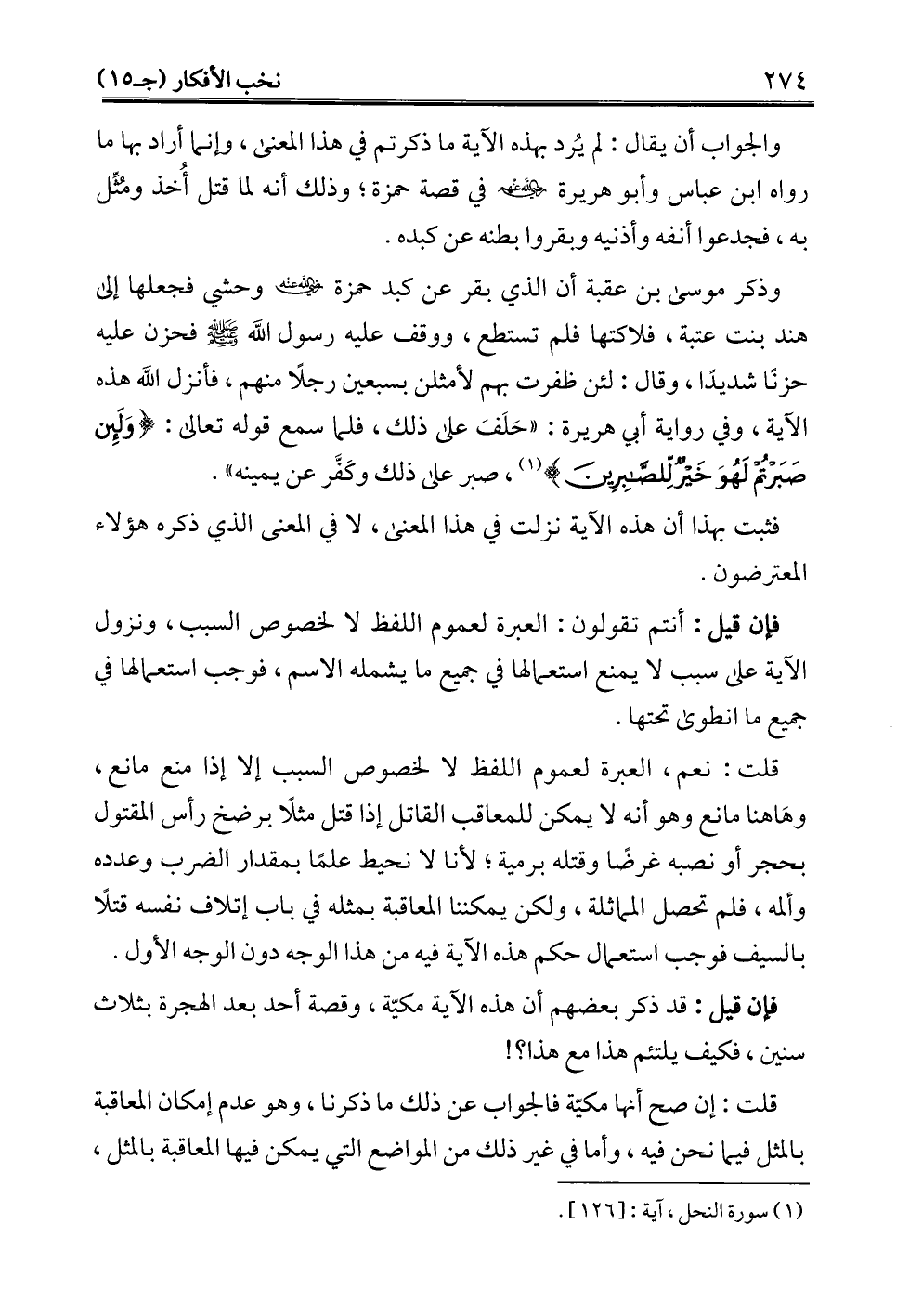 والجواب أن يقال: لم يُرد بهذه الآية ما ذكرتم في هذا المعنى، وإنما أراد بها ما رواه ابن عباس وأبو هريرة - رضي الله عنهم - في قصة حمزة؛ وذلك أنه لما قتل أُخذ ومُثِّل به، فجدعوا أنفه وأذنيه وبقروا بطنه عن كبده.