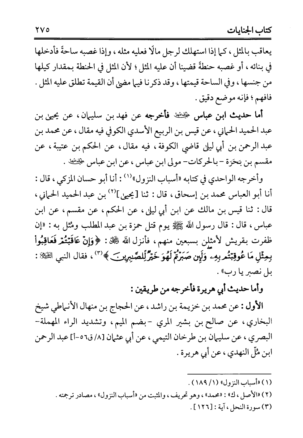 وأخرجه الواحدي في كتابه "أسباب النزول" (¬1): أنا أبو حسان المزكي، قال: أنا أبو العباس محمَّد بن إسحاق، قال: ثنا [يحيى] (¬2) بن عبد الحميد الحماني، قال: ثنا قيس بن مالك عن ابن أبي ليلى، عن الحكم، عن مقسم، عن ابن عباس، قال: قال رسول الله - صلى الله عليه وسلم - يوم قتل حمزة بن عبد المطلب ومُثل به: "إن ظفرت بقريش لأمثلن بسبعين منهم، فأنزل الله -عز وجل-: {وَإِنْ عَاقَبْتُمْ فَعَاقِبُوا بِمِثْلِ مَا عُوقِبْتُمْ بِهِ وَلَئِنْ صَبَرْتُمْ لَهُوَ خَيْرٌ لِلصَّابِرِينَ} (¬3)، فقال النبي -عليه السلام-: بل نصبر يا رب".