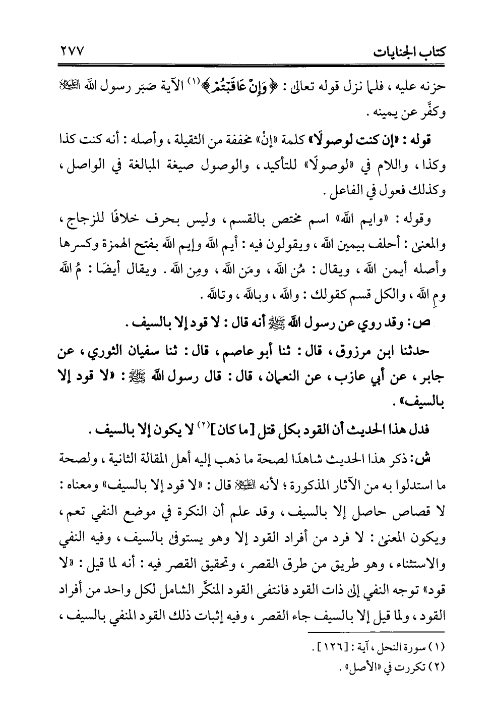 ش: ذكر هذا الحديث شاهدًا لصحة ما ذهب إليه أهل المقالة الثانية، ولصحة ما استدلوا به من الآثار المذكورة؛ لأنه -عليه السلام- قال: "لا قود إلا بالسيف" ومعناه: لا قصاص حاصل إلا بالسيف، وقد علم أن النكرة في موضع النفي تعم، ويكون المعنى: لا فرد من أفراد القود إلا وهو يستوفى بالسيف، وفيه النفي والاستثناء، وهو طريق من طرق القصر، وتحقيق القصر فيه: أنه لما قيل: "لا قود" توجه النفي إلى ذات القود فانتفى القود المنكَّر الشامل لكل واحد من أفراد القود، ولما قيل إلا بالسيف جاء القصر، وفيه إثبات ذلك القود المنفي بالسيف،
