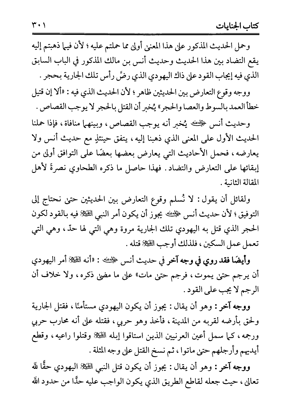 وحديث أنس - رضي الله عنه - يُخبر أنه يوجب القصاص، وبينهما منافاة، فإذا حملنا الحديث الأول على المعنى الذي ذهبنا إليه، يتفق حينئذٍ مع حديث أنس ولا يعارضه، فحمل الأحاديث التي يعارض بعضها بعضًا على التوافق أولى من إبقائها على التعارض والتضاد. فهذا حاصل ما ذكره الطحاوي نصرةً لأهل المقالة الثانية.