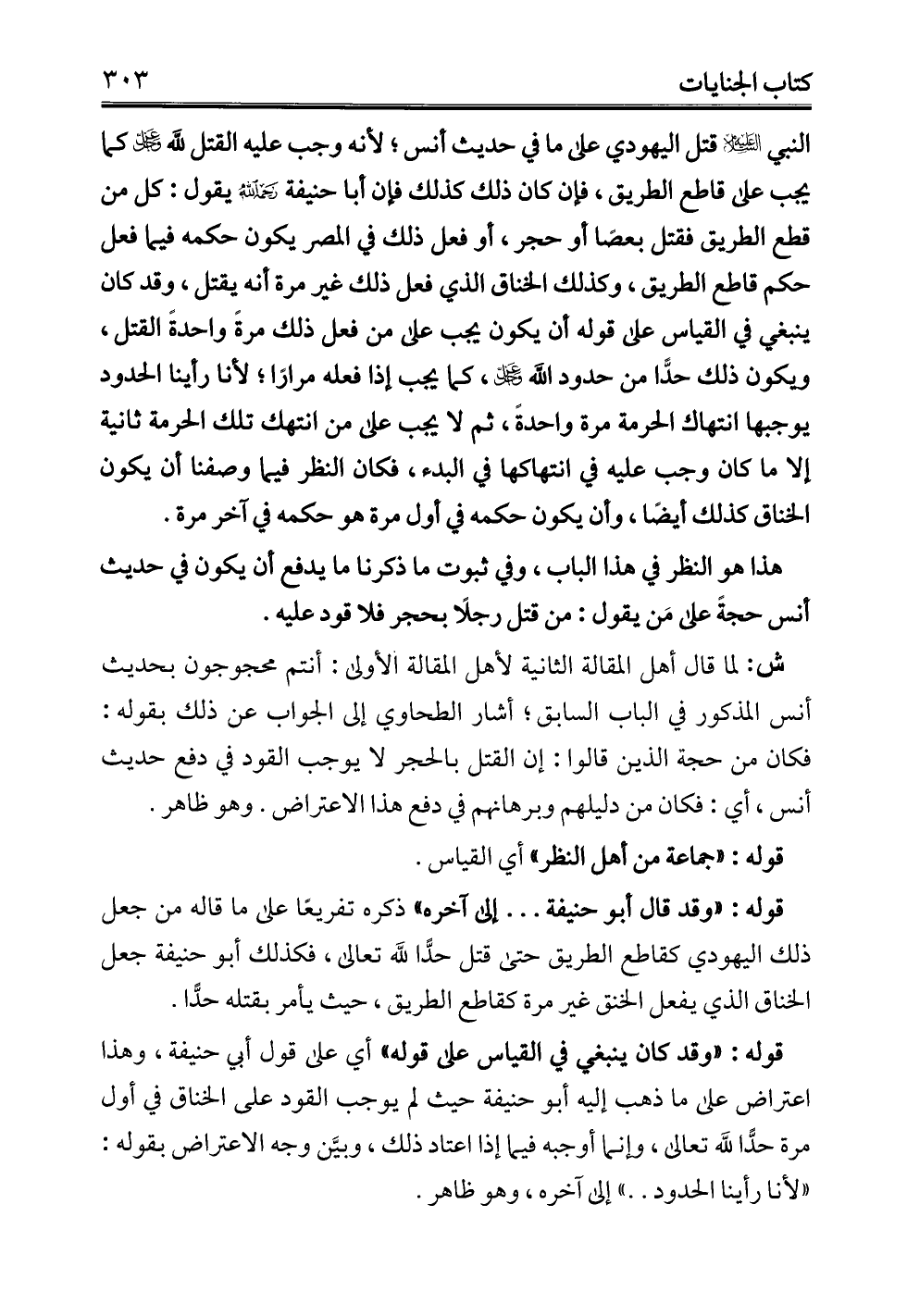 النبي -عليه السلام- قتل اليهودي على ما في حديث أنس؛ لأنه وجب عليه القتل لله -عز وجل- كما يجب على قاطع الطريق، فإن كان ذلك كذلك فإن أبا حنيفة -رحمه الله- يقول: كل من قطع الطريق فقتل بعصًا أو حجر، أو فعل ذلك في المصر يكون حكمه فيما فعل حكم قاطع الطريق، وكذلك الخناق الذي فعل ذلك غير مرة أنه يقتل، وقد كان ينبغي في القياس على قوله أن يكون يجب على من فعل ذلك مرةً واحدةً القتل، ويكون ذلك حدًّا من حدود الله -عز وجل-، كما يجب إذا فعله مرارًا؛ لأنا رأينا الحدود يوجبها انتهاك الحرمة مرة واحدةً، ثم لا يجب على من انتهك تلك الحرمة ثانية إلا ما كان وجب عليه في انتهاكها في البدء، فكان النظر فيما وصفنا أن يكون الخناق كذلك أيضًا، وأن يكون حكمه في أول مرة هو حكمه في آخر مرة.
