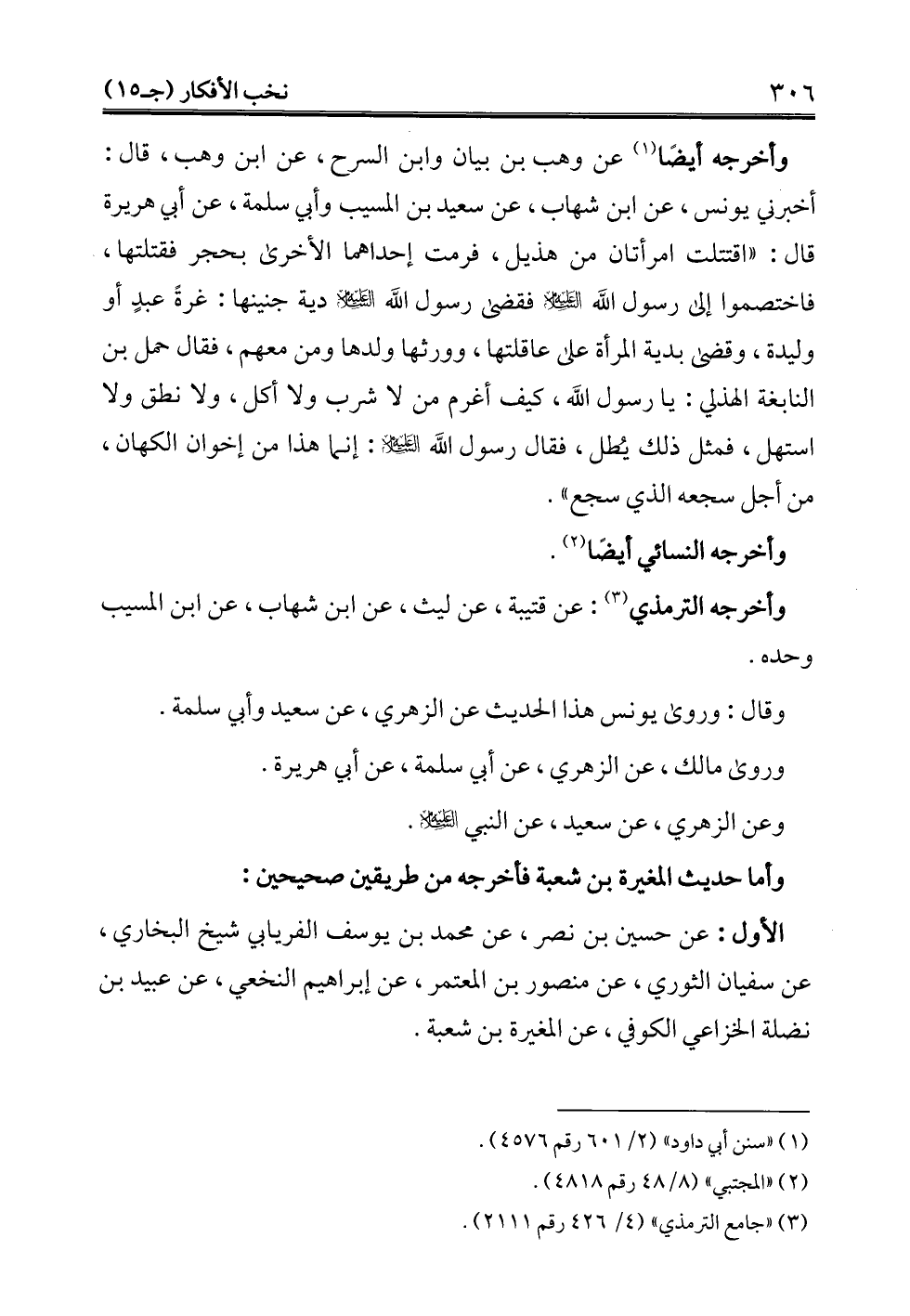 وأخرجه أيضًا (¬1) عن وهب بن بيان وابن السرح، عن ابن وهب، قال: أخبرني يونس، عن ابن شهاب، عن سعيد بن المسيب وأبي سلمة، عن أبي هريرة قال: "اقتتلت امرأتان من هذيل، فرمت إحداهما الأخرى بحجر فقتلتها، فاختصموا إلى رسول الله -عليه السلام- فقضى رسول الله -عليه السلام- دية جنينها: غرةً عبدٍ أو وليدة، وقضى بدية المرأة على عاقلتها، وورثها ولدها ومن معهم، فقال حمل بن النابغة الهذلي: يا رسول الله، كيف أغرم من لا شرب ولا أكل، ولا نطق ولا استهل، فمثل ذلك يُطل، فقال رسول الله -عليه السلام-: إنما هذا من إخوان الكهان، من أجل سجعه الذي سجع".